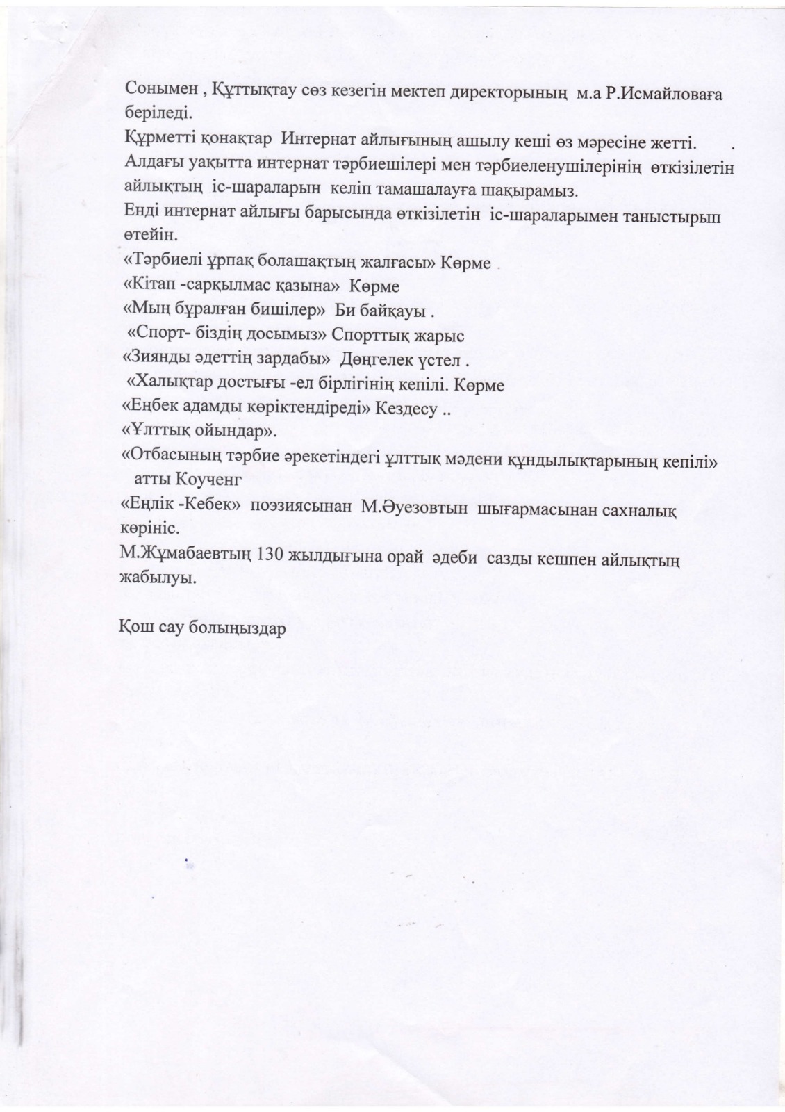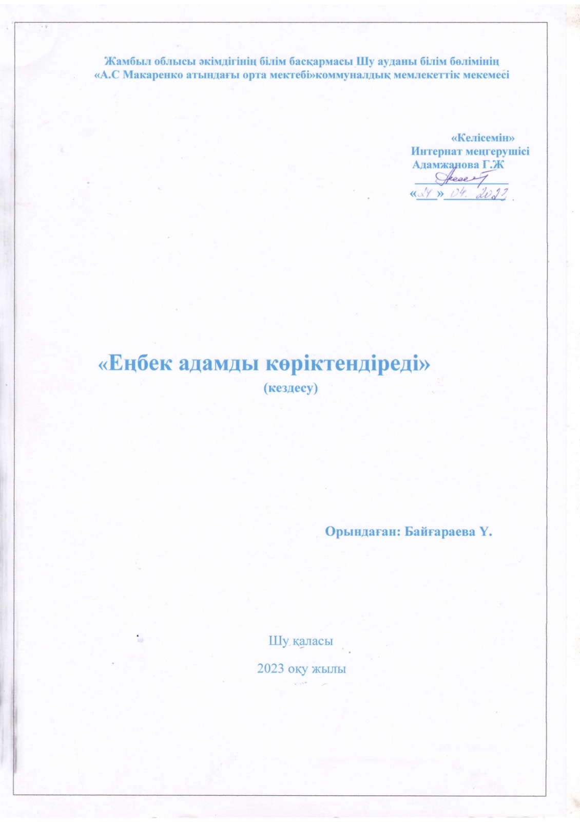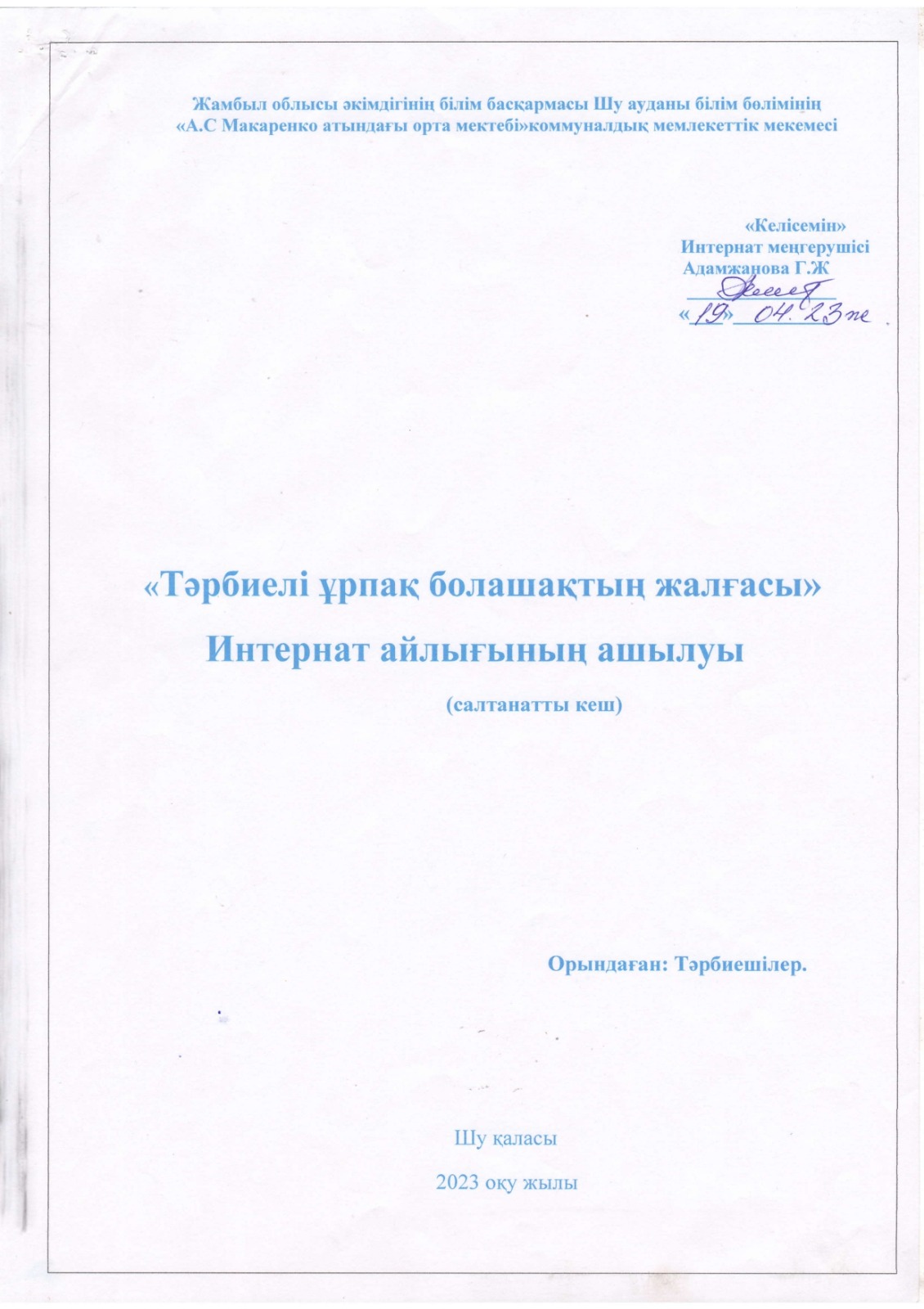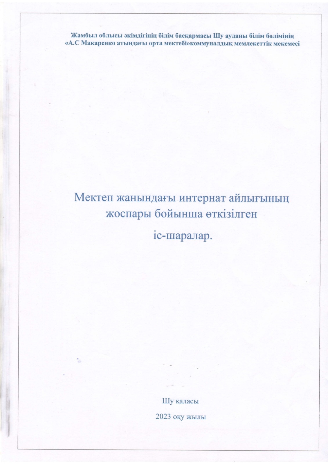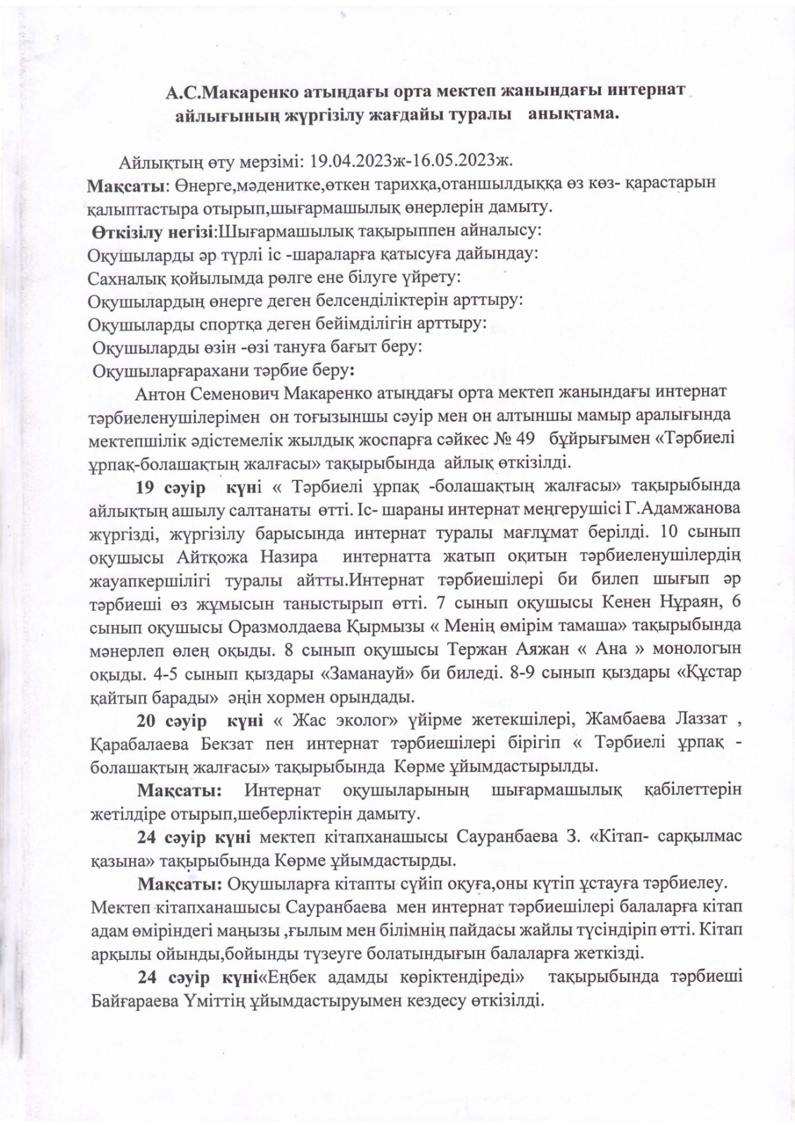 "Тәрбиелі ұрпақ - болашақтың жалғасы" тақырыбында мектеп жанындағы интернат айлығының жоспары бойынша өткізілген іс-шаралар » «Жамбыл облысы әкімдігінің білім басқармасы Шу ауданының білім бөлімінің «Антон Семенович Макаренко атындағы орта мектебі» коммуналдық мемлекеттік мекемесі