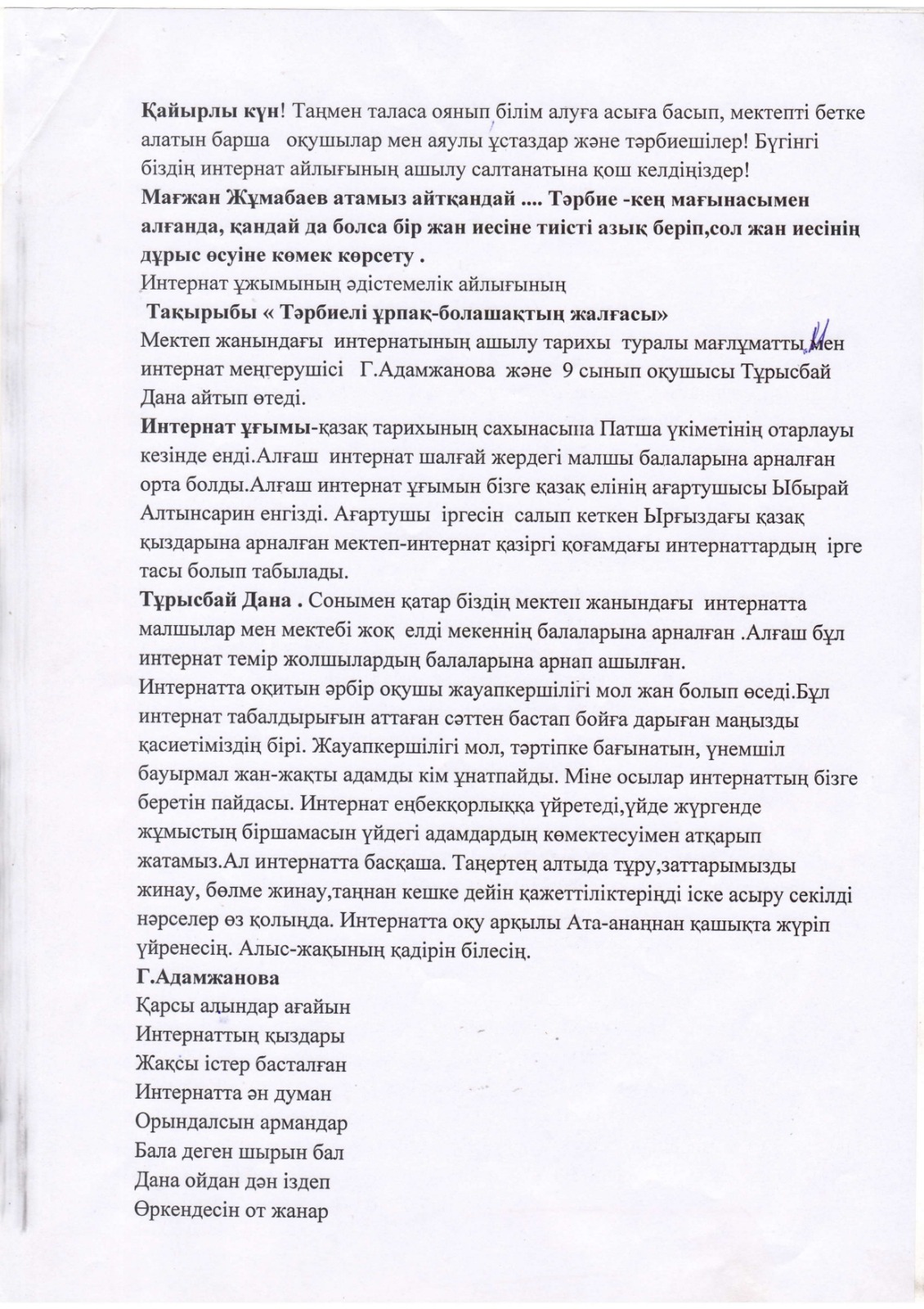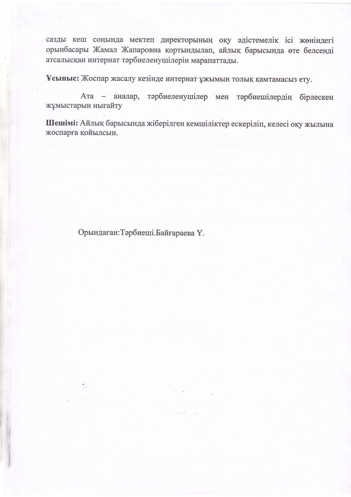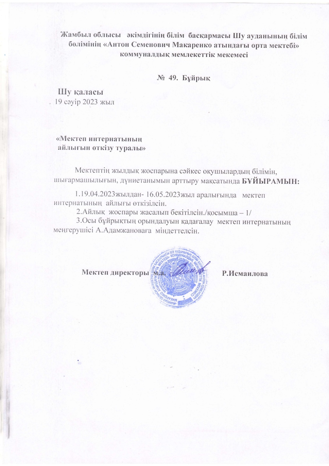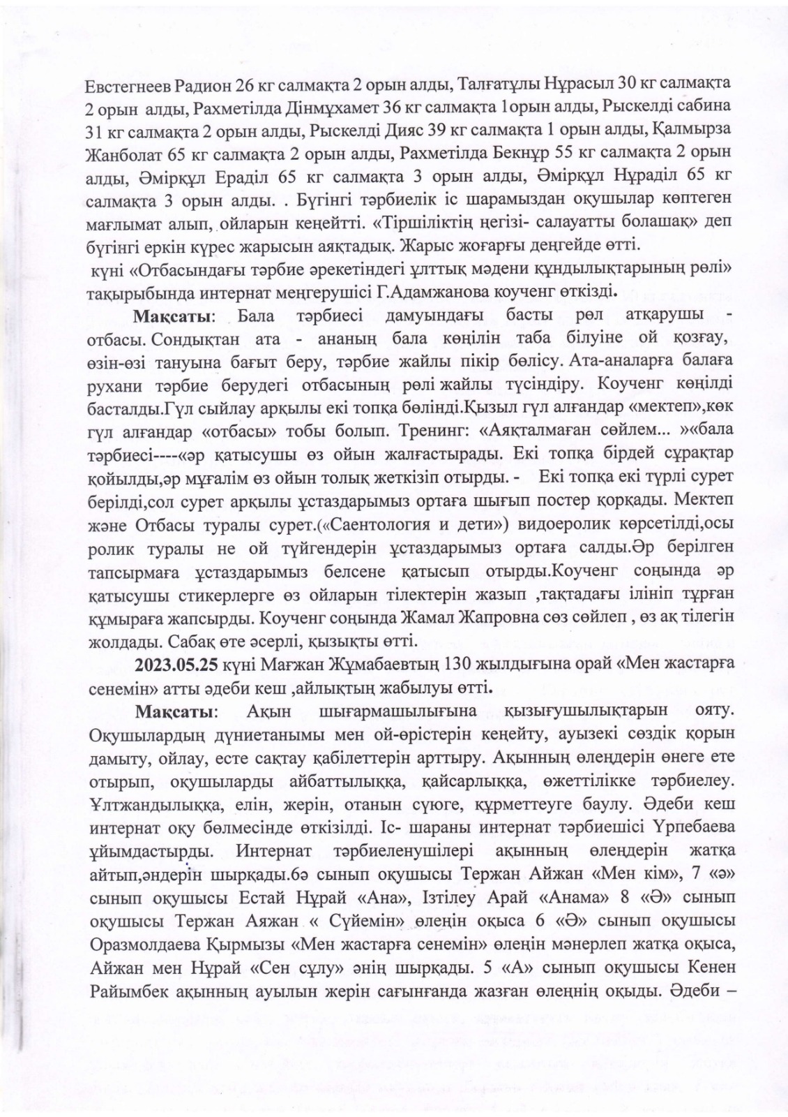 "Тәрбиелі ұрпақ - болашақтың жалғасы" тақырыбында мектеп жанындағы интернат айлығының жоспары бойынша өткізілген іс-шаралар » «Жамбыл облысы әкімдігінің білім басқармасы Шу ауданының білім бөлімінің «Антон Семенович Макаренко атындағы орта мектебі» коммуналдық мемлекеттік мекемесі