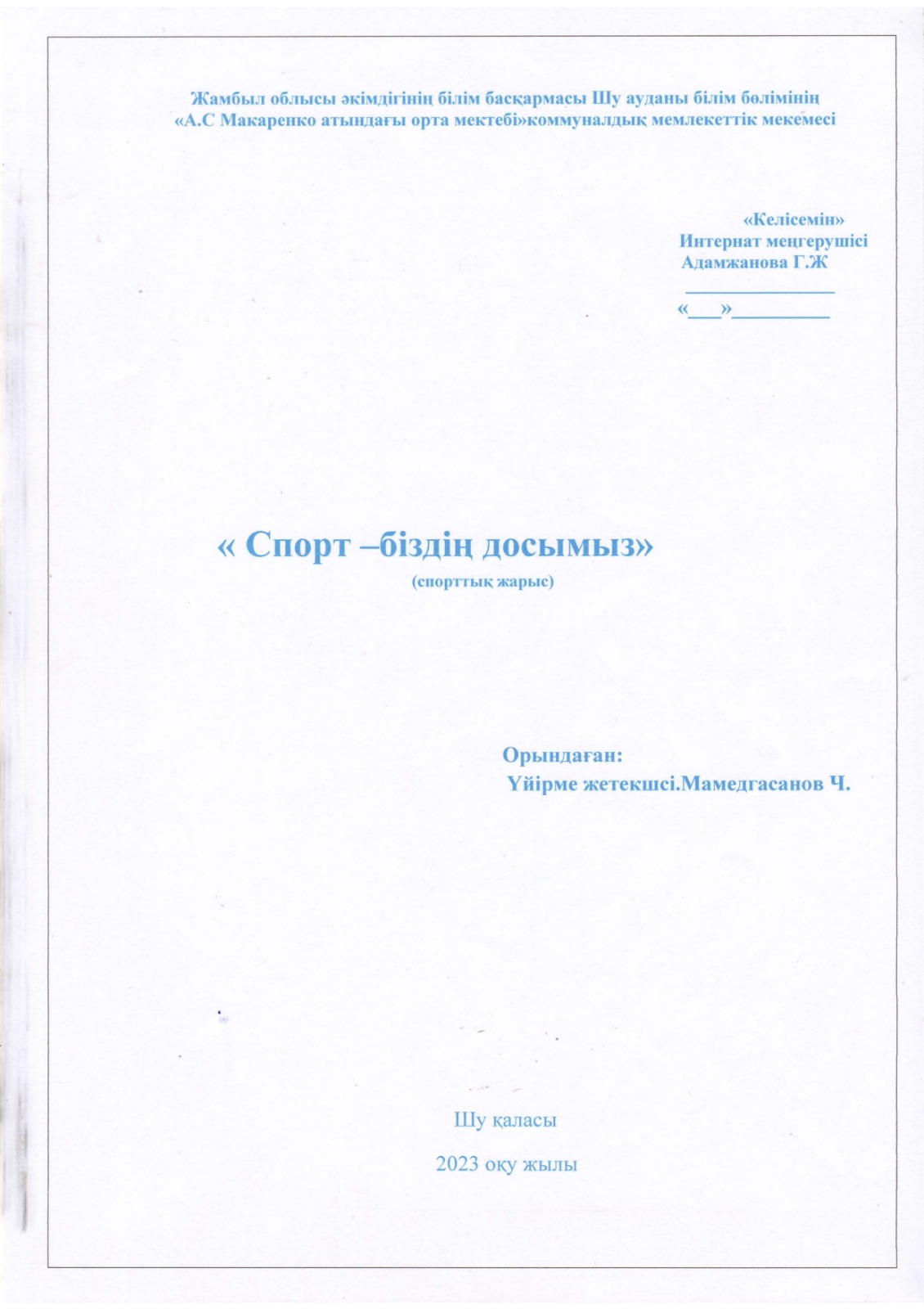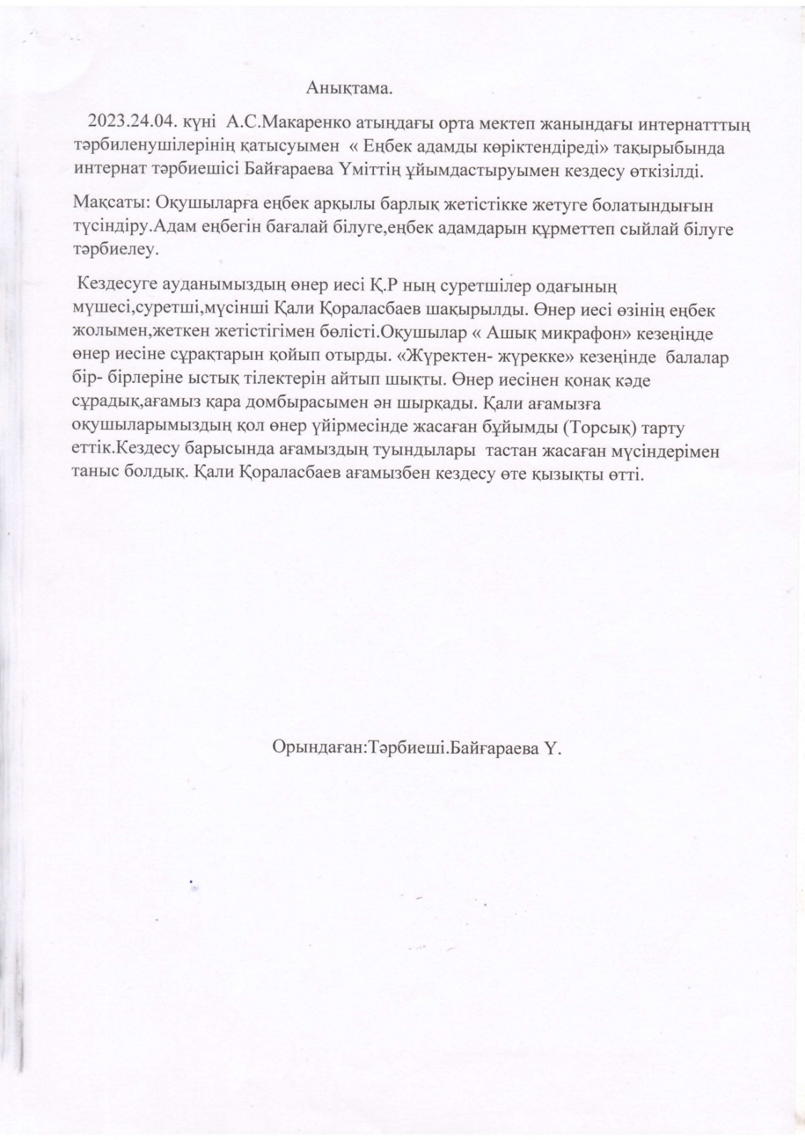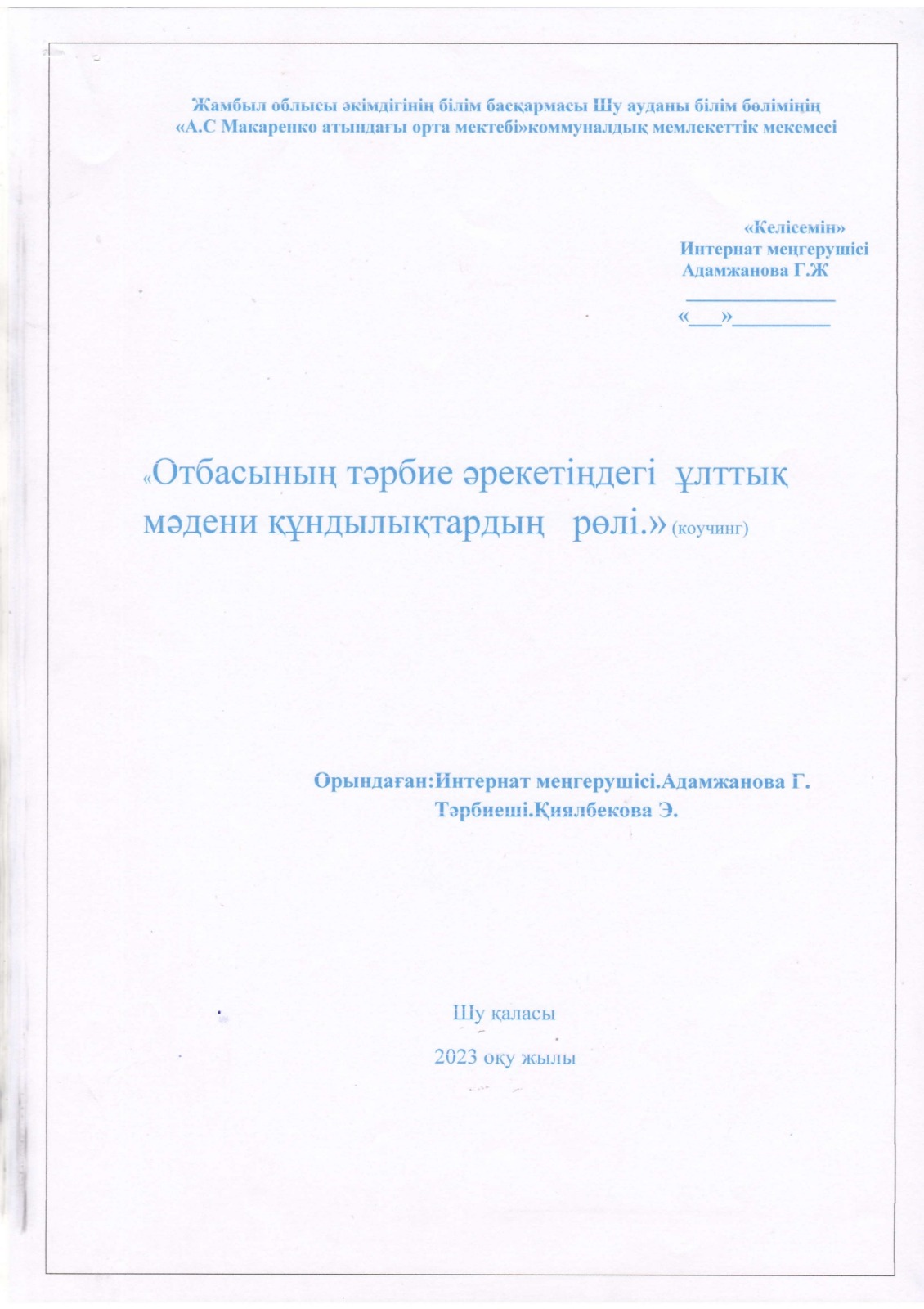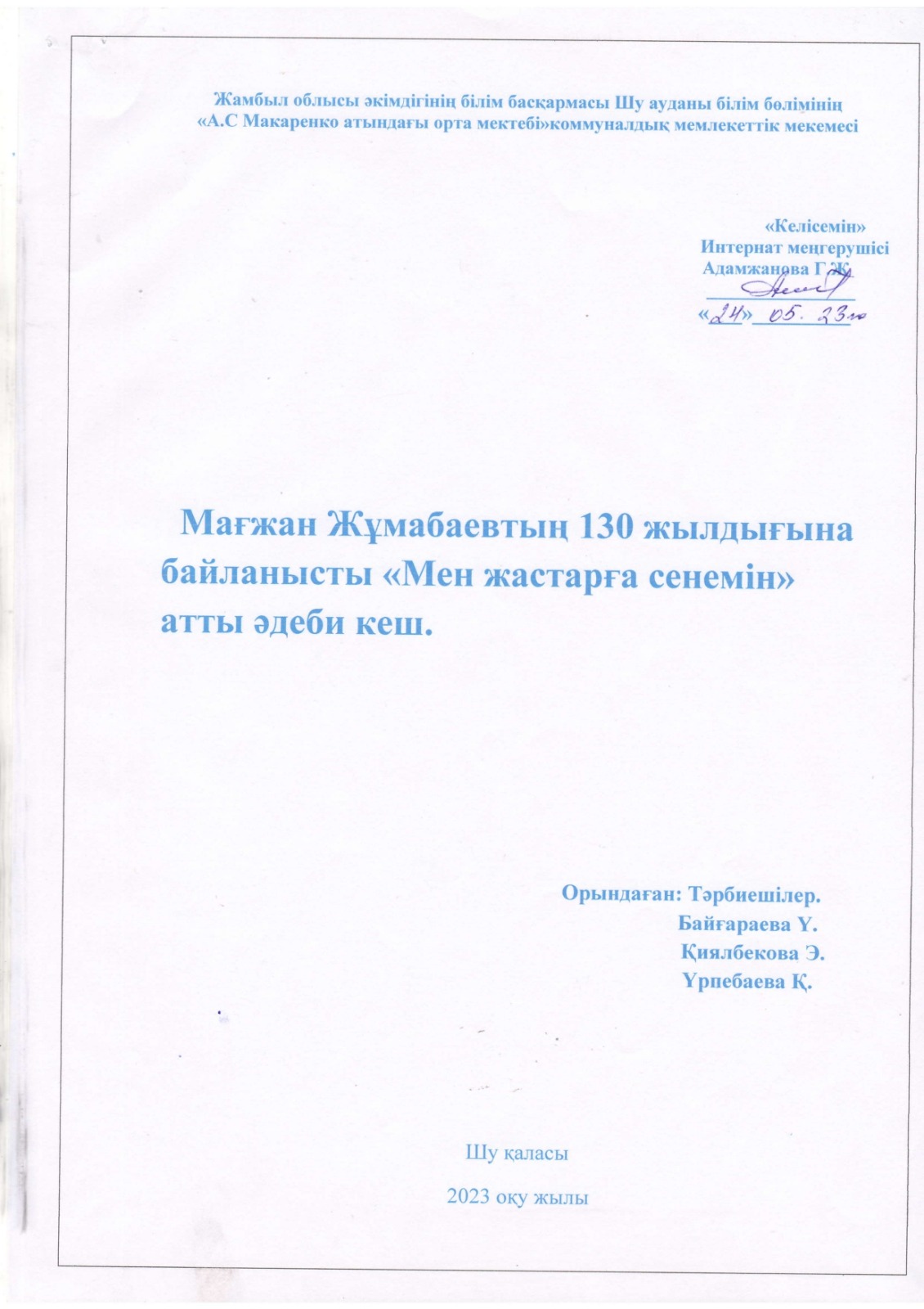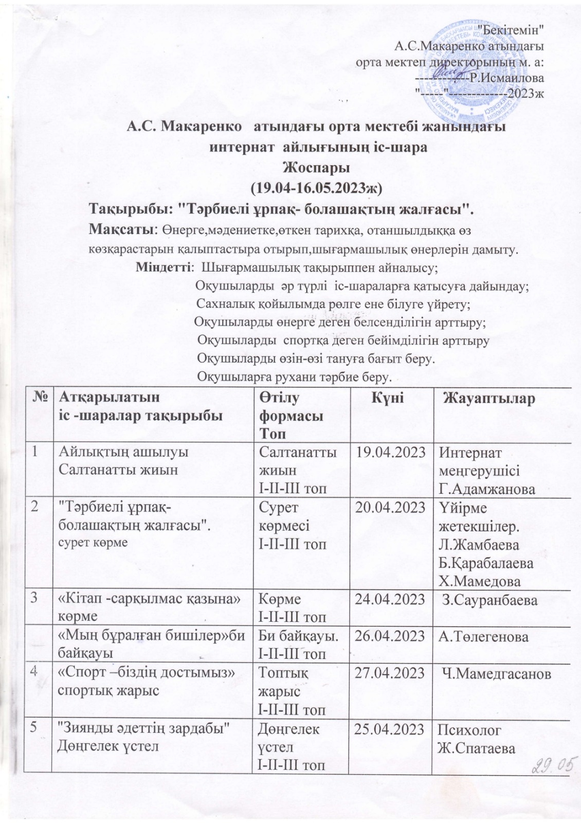 "Тәрбиелі ұрпақ - болашақтың жалғасы" тақырыбында мектеп жанындағы интернат айлығының жоспары бойынша өткізілген іс-шаралар » «Жамбыл облысы әкімдігінің білім басқармасы Шу ауданының білім бөлімінің «Антон Семенович Макаренко атындағы орта мектебі» коммуналдық мемлекеттік мекемесі