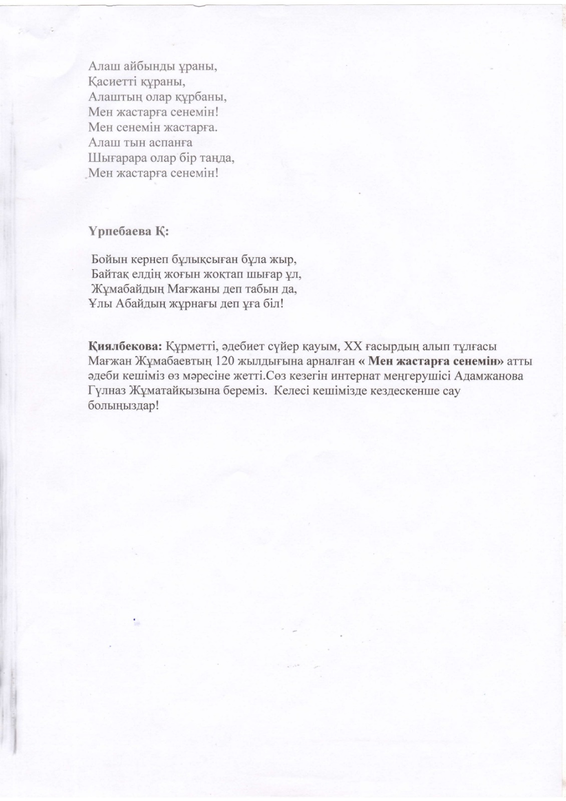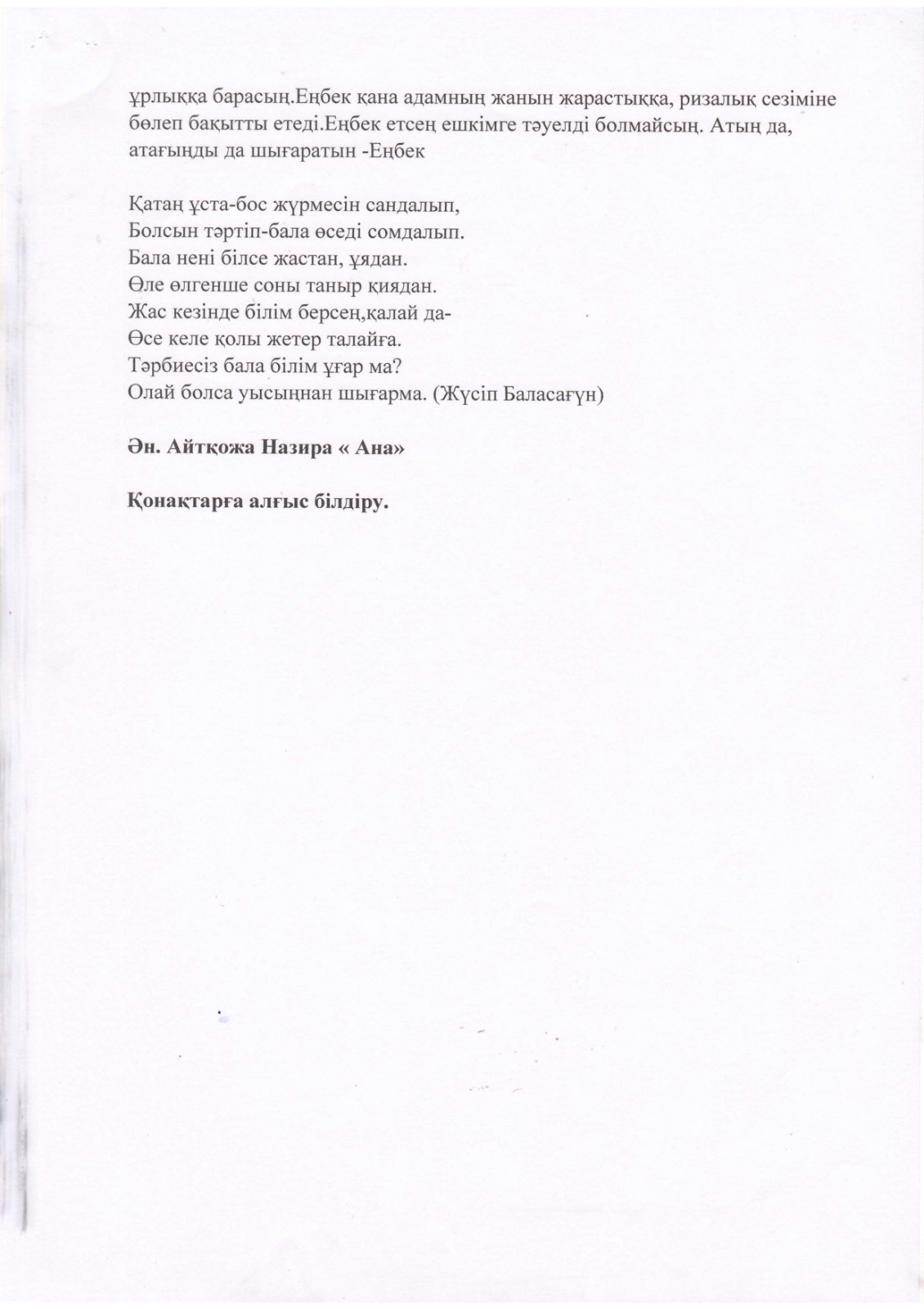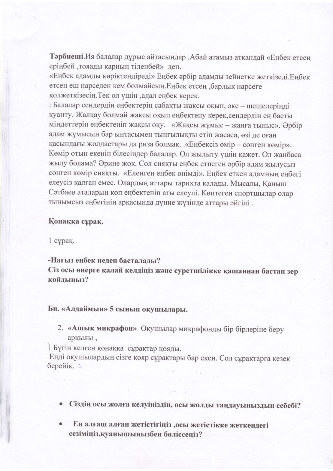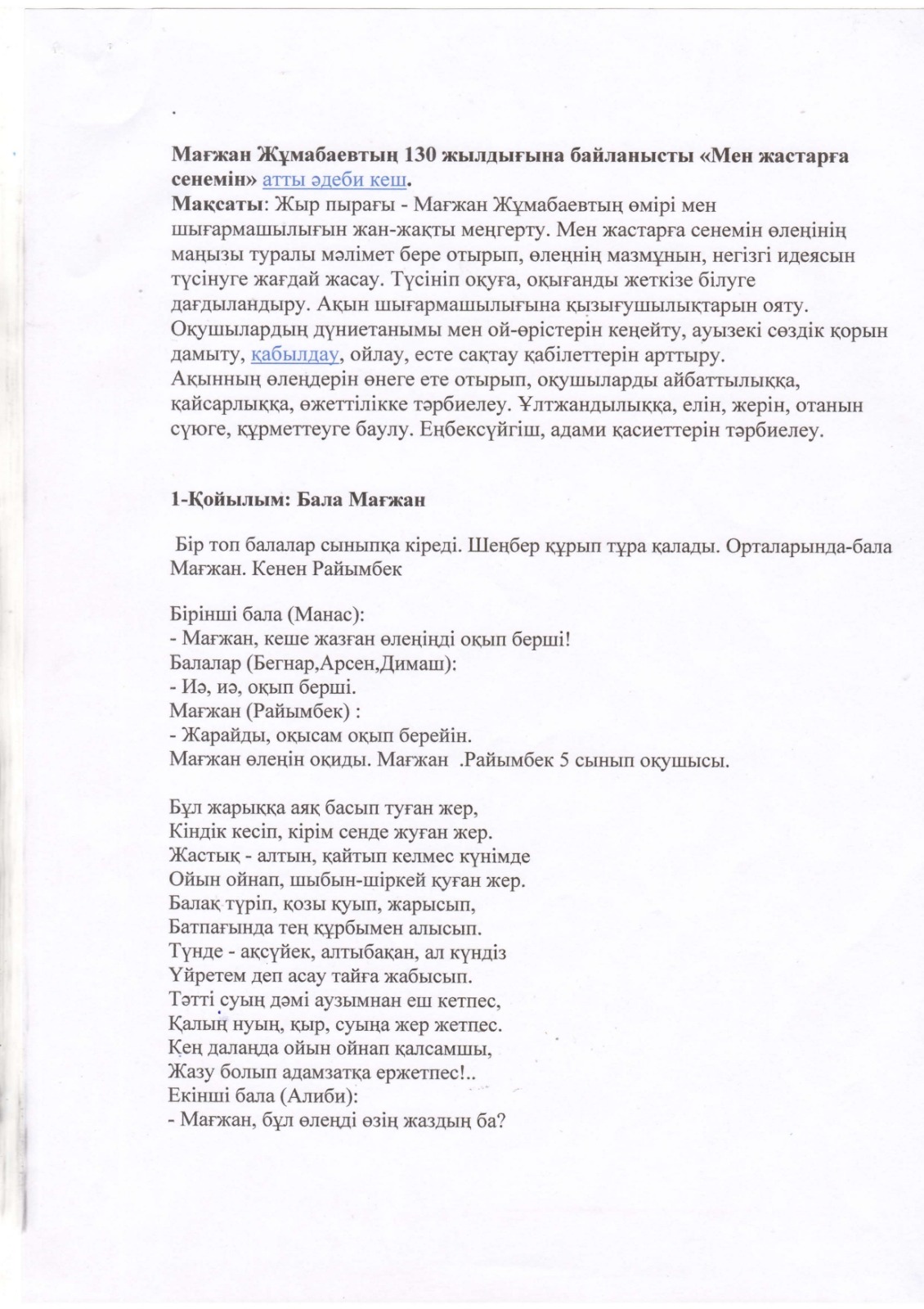 "Тәрбиелі ұрпақ - болашақтың жалғасы" тақырыбында мектеп жанындағы интернат айлығының жоспары бойынша өткізілген іс-шаралар » «Жамбыл облысы әкімдігінің білім басқармасы Шу ауданының білім бөлімінің «Антон Семенович Макаренко атындағы орта мектебі» коммуналдық мемлекеттік мекемесі