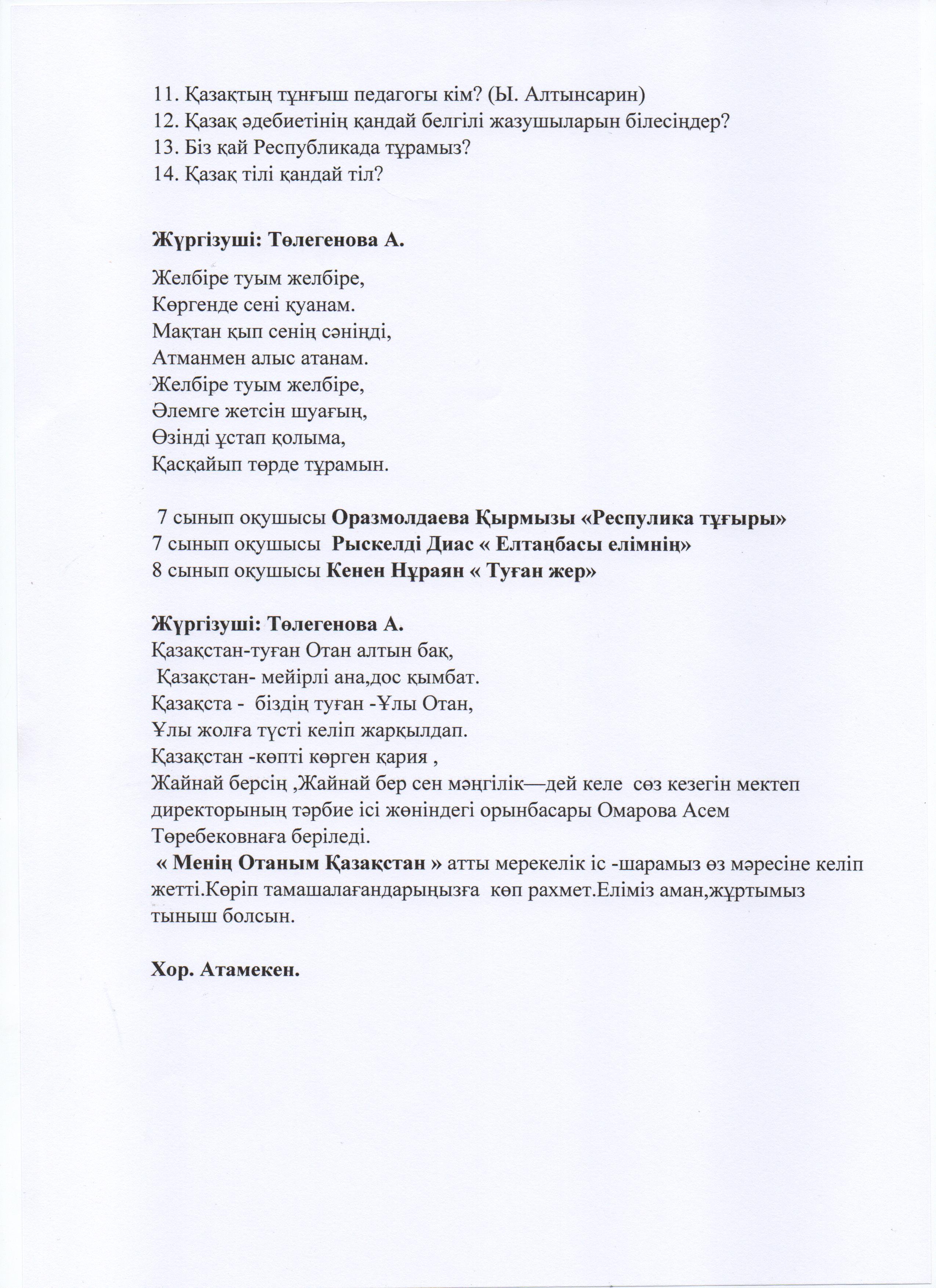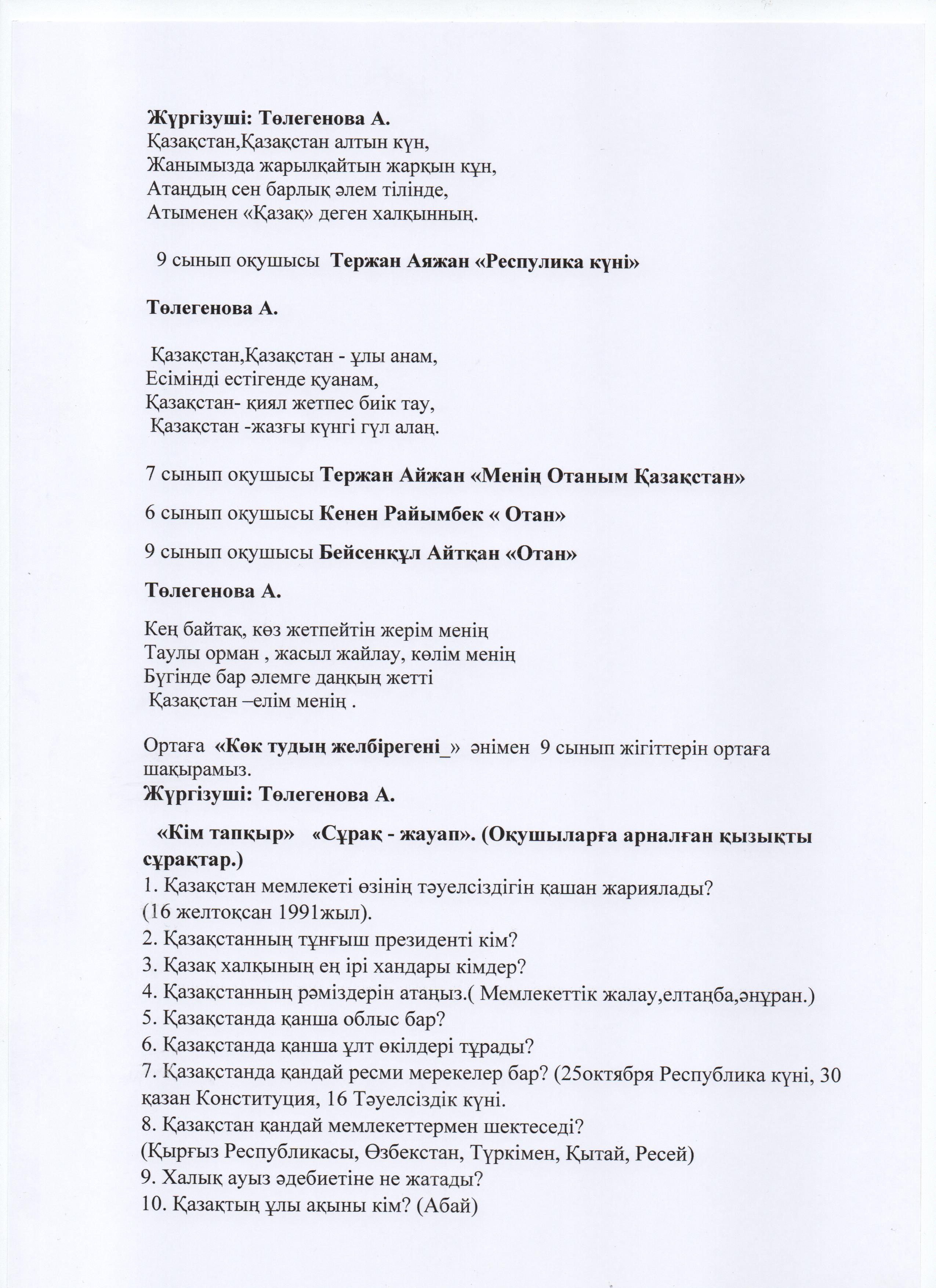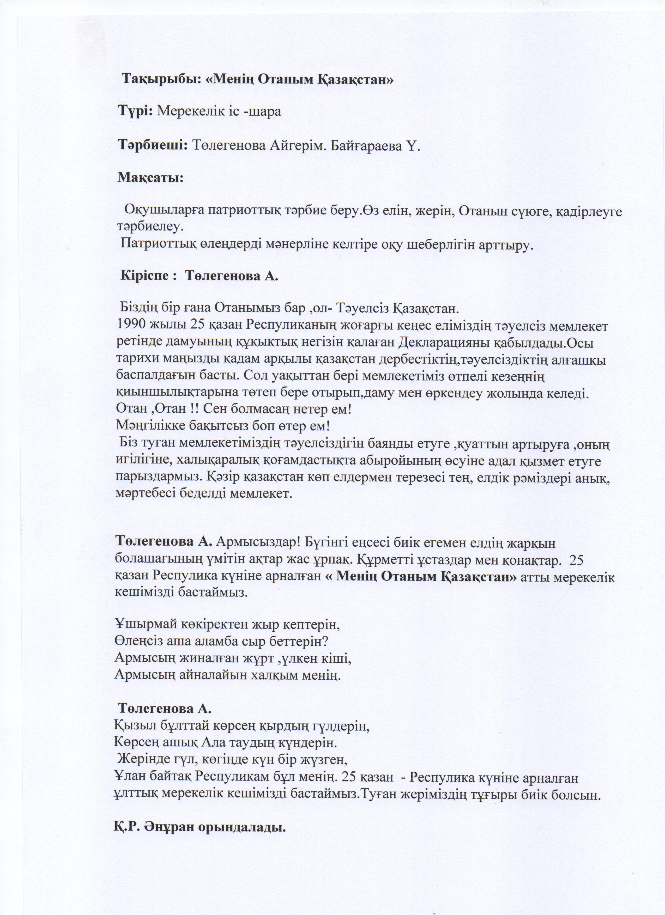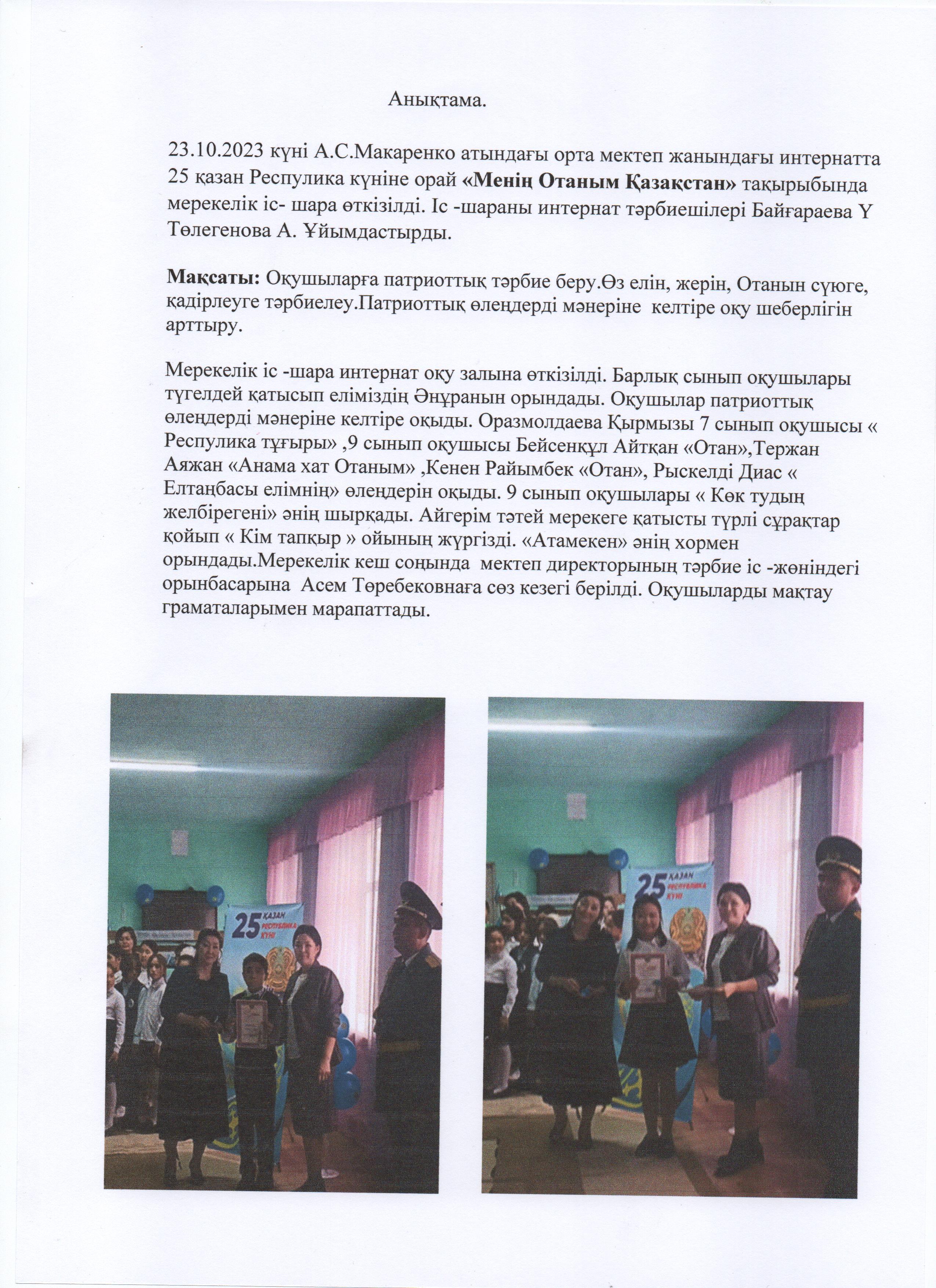 25 қазан Респулика күніне орай "Менің Отаным Қазақстан"тақырыбында мерекелік іс-шара өткізілді. » «Жамбыл облысы әкімдігінің білім басқармасы Шу ауданының білім бөлімінің «Антон Семенович Макаренко атындағы орта мектебі» коммуналдық мемлекеттік мекемесі
