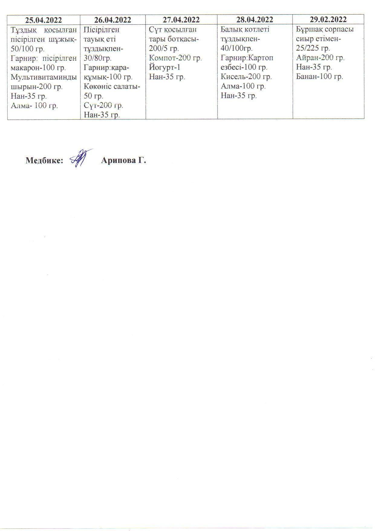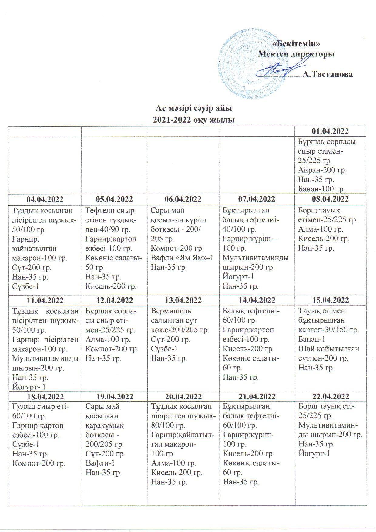 Ас мәзірі. Сәуір айы. » «Zhambyl region әкімдігінің білім басқармасы Шу ауданының білім бөлімінің «Антон Семенович Макаренко атындағы орта мектебі» коммуналдық мемлекеттік мекемесі
