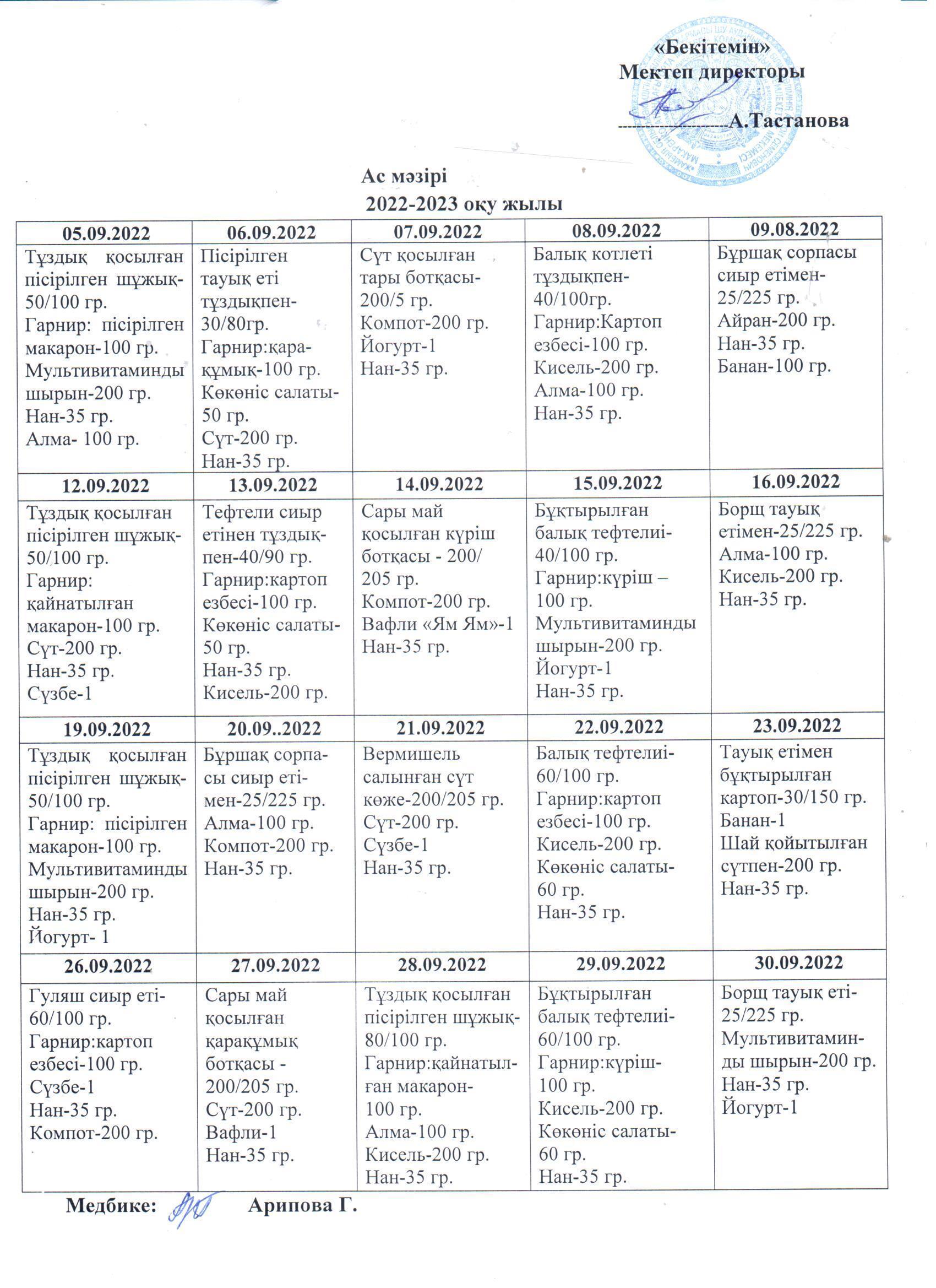 Ас мәзірі қыркүйек айы » «Zhambyl region әкімдігінің білім басқармасы Шу ауданының білім бөлімінің «Антон Семенович Макаренко атындағы орта мектебі» коммуналдық мемлекеттік мекемесі