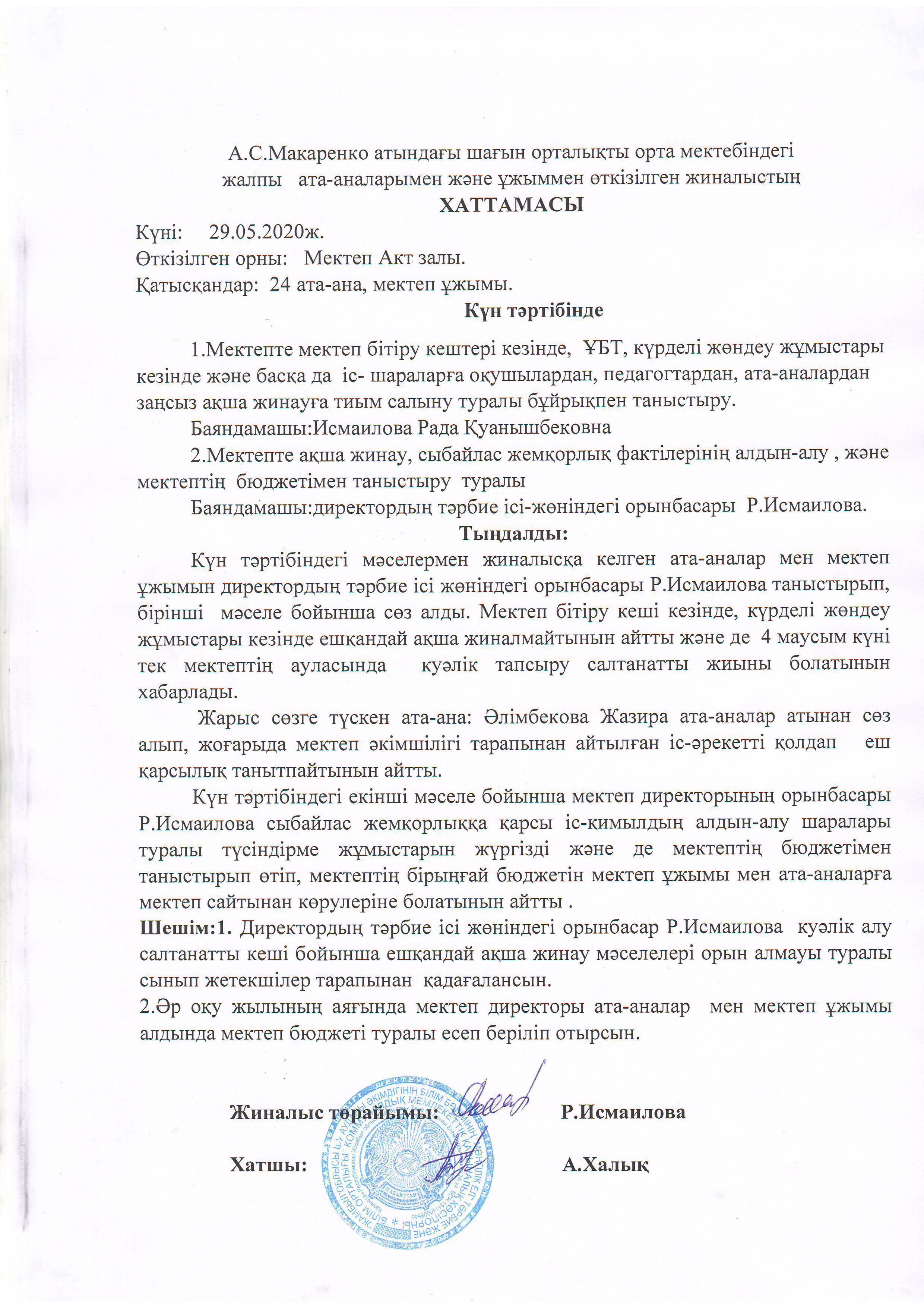 Сыбайлас жемқорлыққа қарсы стратегияны іске асыру бойынша мектепте жоспарға сәйкес жүргізілген жиналыстың хаттамасы » «Жамбыл облысы әкімдігінің білім басқармасы Шу ауданының білім бөлімінің «Антон Семенович Макаренко атындағы орта мектебі» коммуналдық мемлекеттік мекемесі