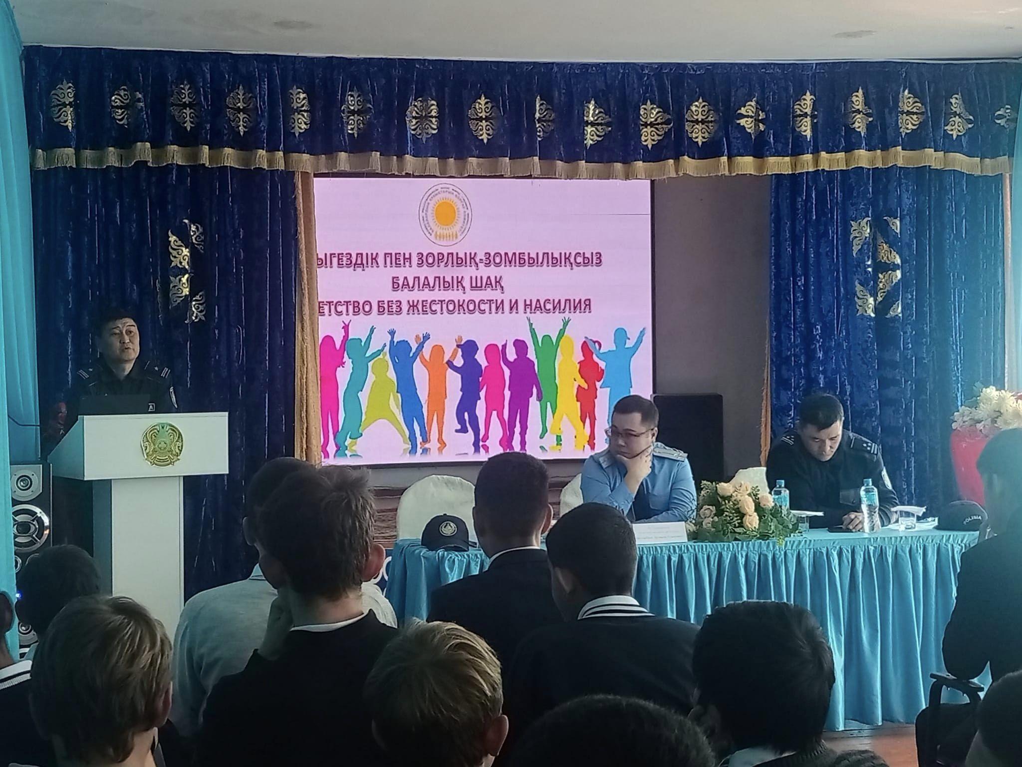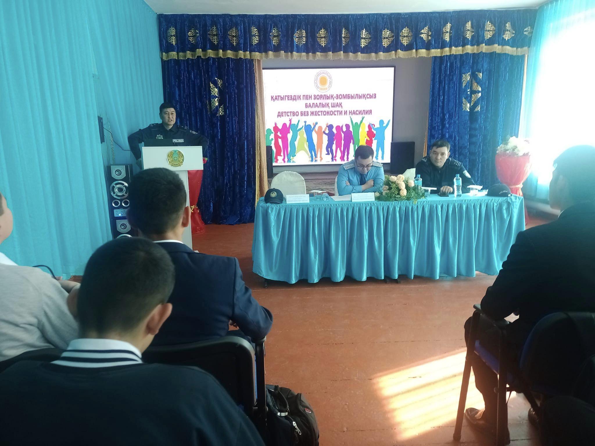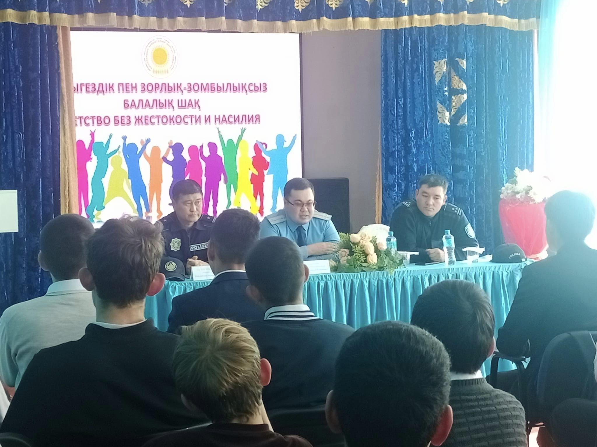 А.С.Макаренко атындағы орта мектебінде Оқу-ағарту министрлігінің бастамасымен Қазақстанда БҰҰ-ның Бала құқықтары туралы конвенциясын ратификациялау негізінде 8-20 қараша аралығында «Қатыгездік пен зорлық-зомбылықсыз балалық шақ» республикалық ақпараттық науқаны аясында №3-мобильді топтың жетекшісі, Шу ауданаралық прокуратурасының прокуроры Малдыбаев Қуаныш Есжанович 6-10 сынып оқушыларымен "Мектептегі әлімжеттік және оның жауапкершілігі" тақырыбында кездесу ұйымдастырды. Аталған кездесуге Шу АПБ-нің қызметкерлері де қатысып, "Жасөспірімдердің құқығы мен жауапкершілігі " тақырыбында дәріс оқыды. Іс-шараның мақсаты: Балалар арасында зорлық-зомбылықты, қараусыздық пен паназыздықты, құқық бұзушылықты алдын алу. Іс -шара барысында оқушылар құзырлы орган қызметкерлеріне сұрақтар қойып, жауаптарын алып отырды.
