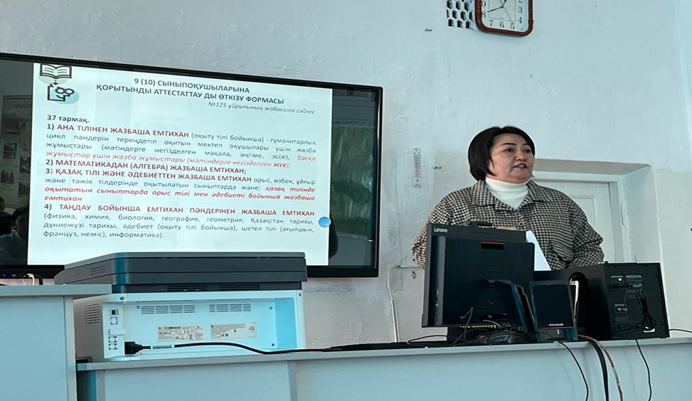 А.С.Макаренко атындағы орта мектебінде 9 сынып білім алушыларын қорытынды аттестаттаудың ережелерімен және Қазақстан Республикасының Оқу-ағарту министрлігінің 4 қазан 2023 жылғы №304 бұйрығымен оқу ісі жөніндегі орынбасары С.Ильясова түсіндірме жұмыстарын жүргізіп, таныстырды.