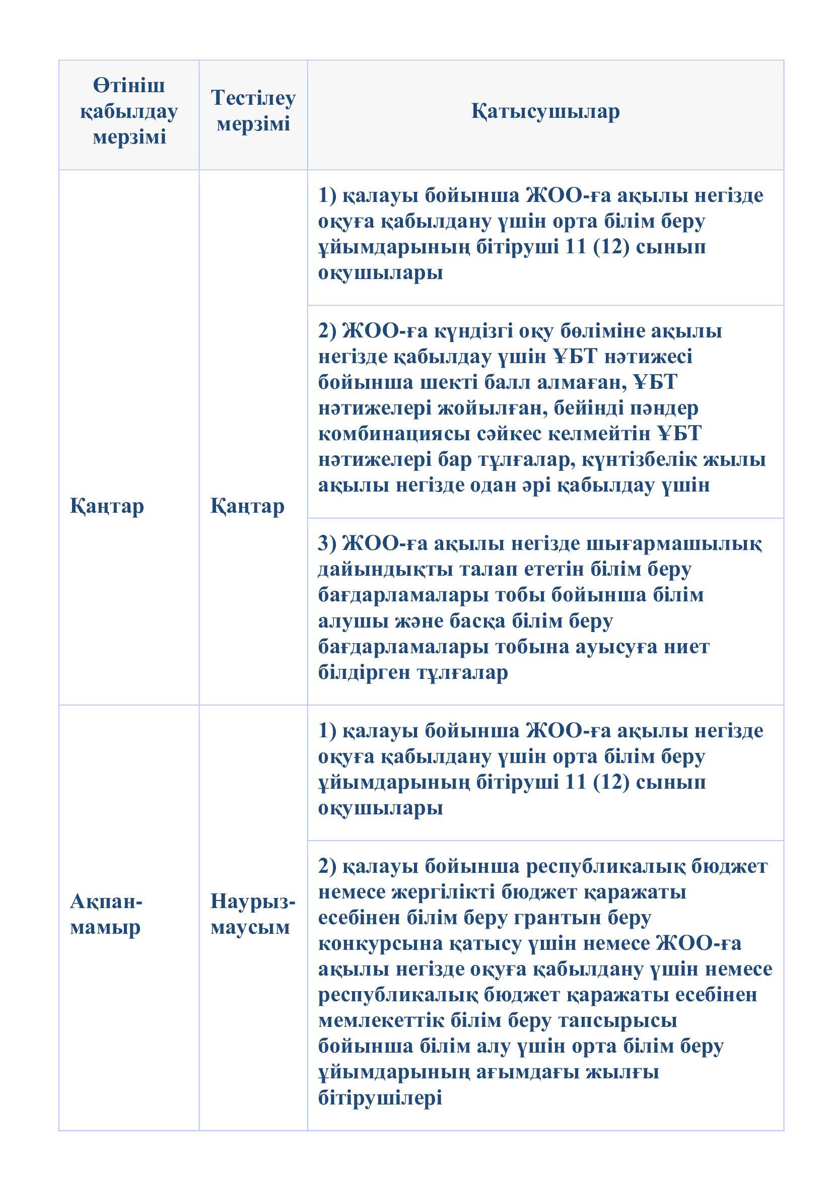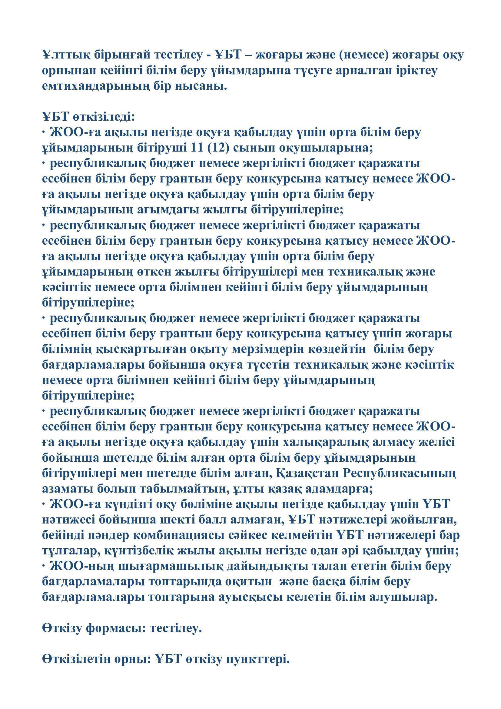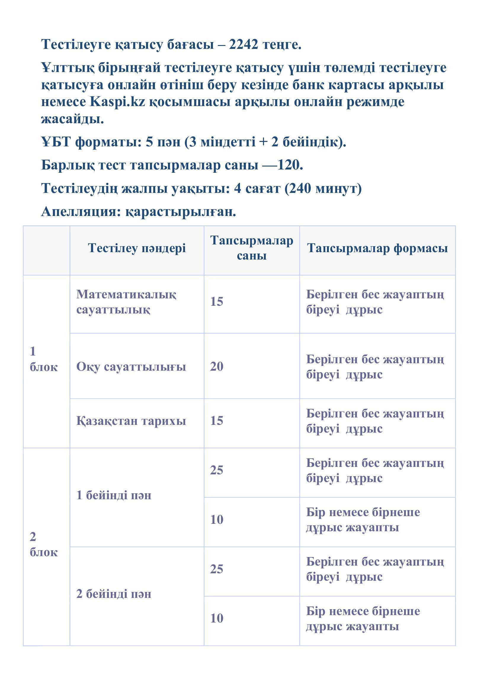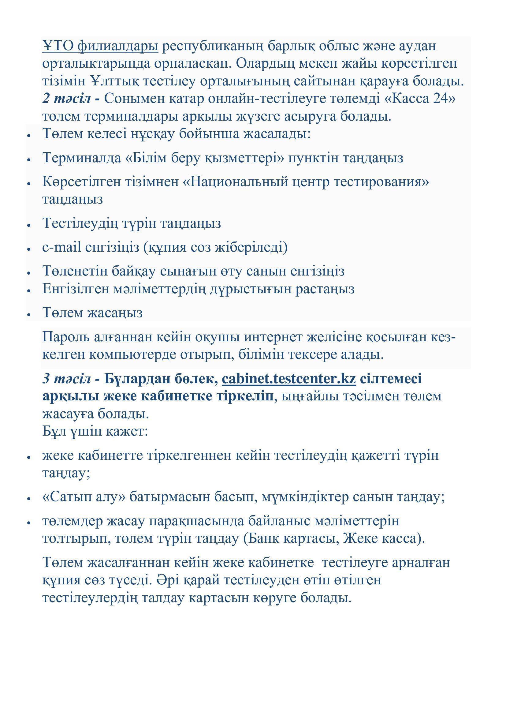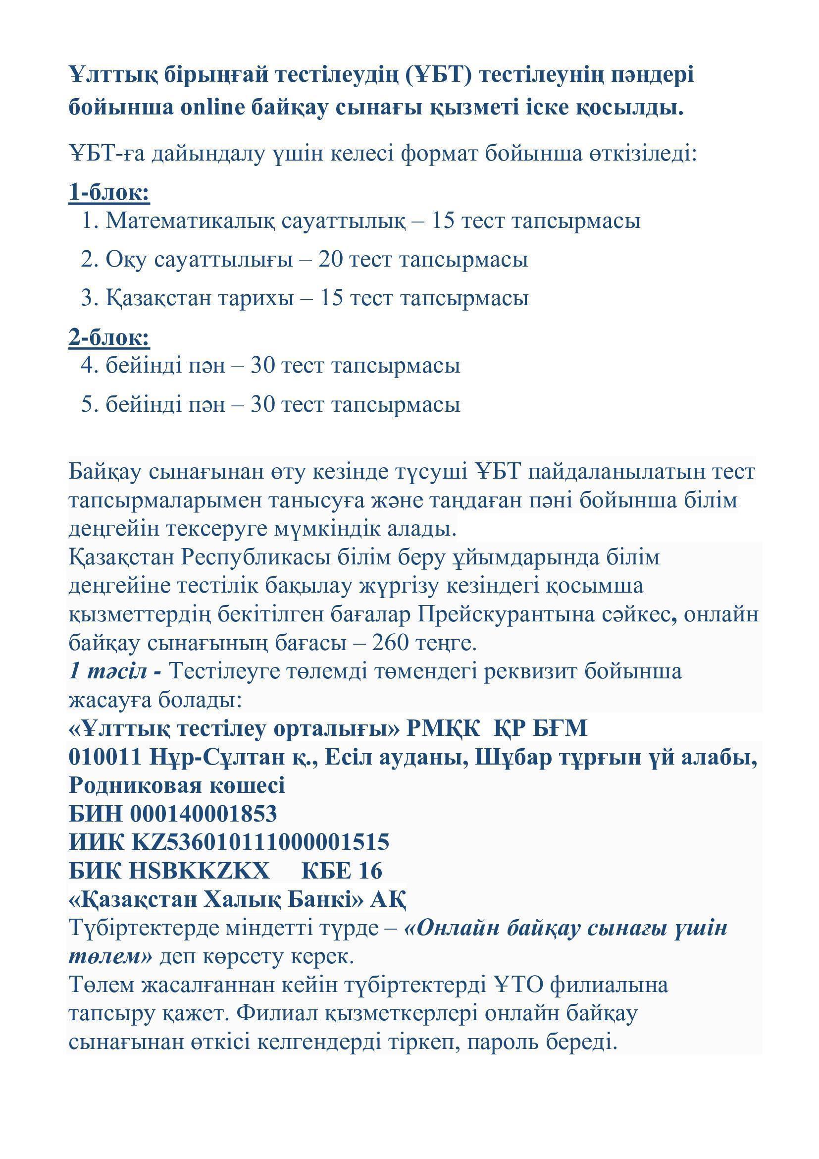 А.С.Макаренко атындағы орта мектебі » ОҚУ ҮРДІСІ » ҰБТ » Ұлттық бірыңғай тестілеу - ҰБТ – жоғары және (немесе) жоғары оқу орнынан кейінгі білім беру ұйымдарына түсуге арналған іріктеу емтихандарының бір ныса