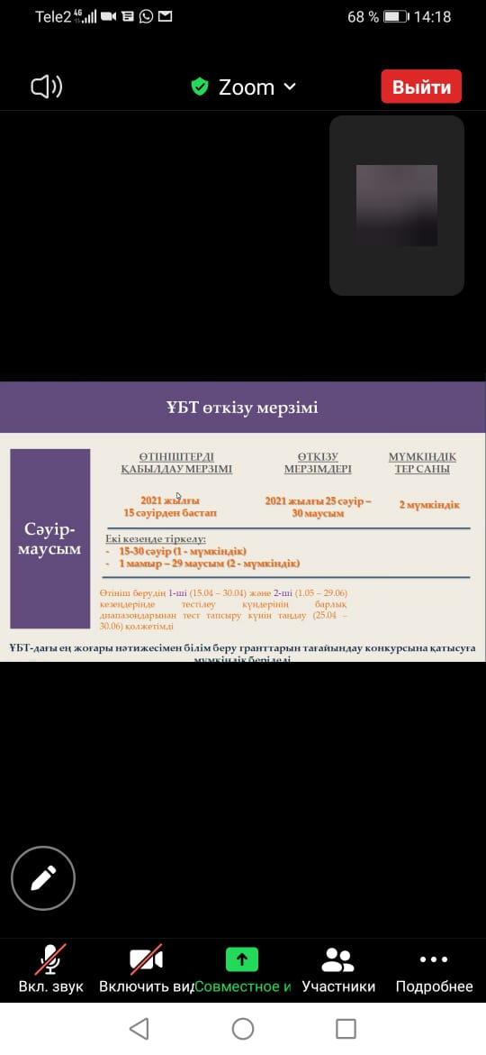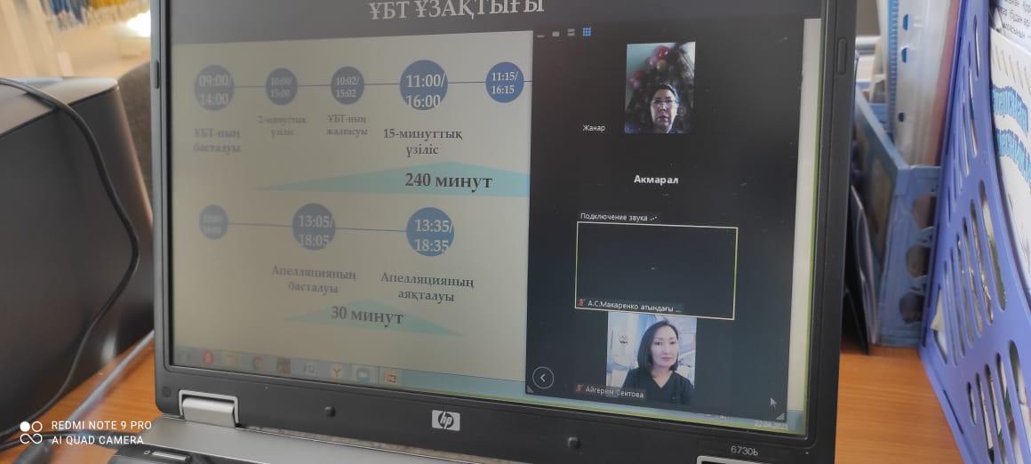 Тақырыбы: "Электрондық форматтағы Ұлттық бірыңғай тестлеуді ұйымдастыру және өткізу бойынша". Ата-аналарға балаларының ҰБТ электронды форматта өтетіні, ҰБТ-ға өтініш беру мерзімдері, республикалық бюджет немесе жергілікті бюджет қаражаты есебінен білім беру грантын алу үшін екі мүмкіндігі бар екені айтылды. Жәнеде жоғары оқу орнына түсетін шекті деңгей балдарымен ата-аналарды таныстырдық: Ұлттық ЖЖОКБҰ-ға-кемінде 65 балл, ал "Педагогикалық ғылымдар" білім беру саласы бойынша-кемінде 70 балл, "Ауыл шаруашылығы және биоресурстар", "Ветеринария білім беру салалары бойынша-кемінде 60 балл. Басқа ЖЖОКБҰ-ға -кемінде 50 балл, "Денсаулық сақтау және әлеуметтік қамтамассыз ету (медицина)" білім беру саласы бойынша -кемінде 65 балл. Сонымен қатар әр ЖЖОКБҰ білім беру бағдарламалары тобы бойынша өз шекті баллын белгілейді. Мектеп директоры А.Тастанова ата-аналардан оқушылардың ҰБТ-ге дайындығын күшейтуді және тест болатын күні жауапкершілікпен қарауды сұранды.