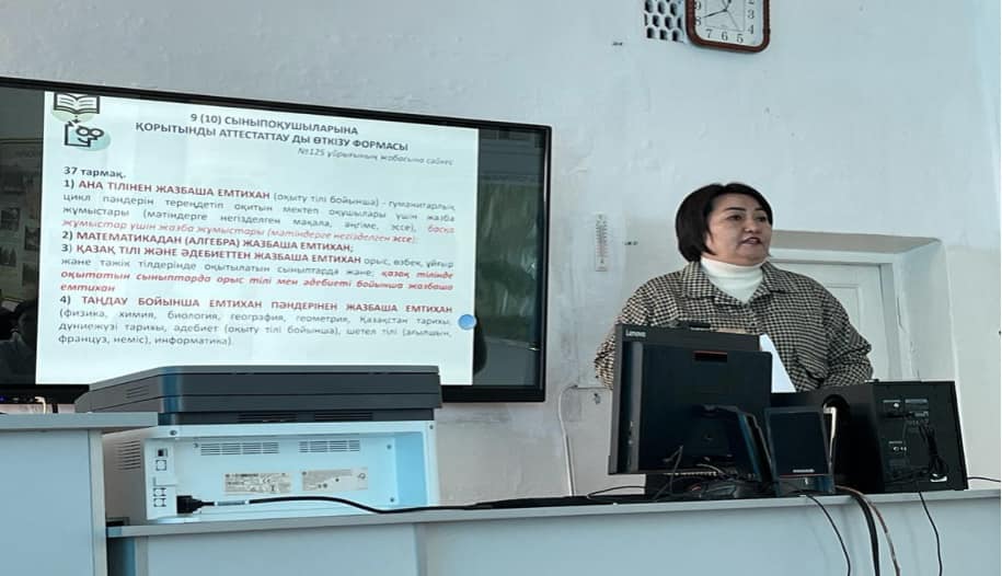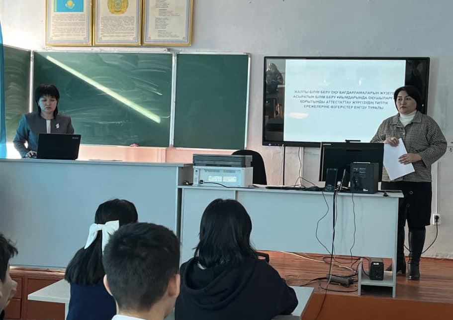 А.С.Макаренко атындағы орта мектебінде 9 сынып білім алушыларын қорытынды аттестаттаудың ережелерімен және Қазақстан Республикасының Оқу-ағарту министрлігінің 4 қазан 2023 жылғы №304 бұйрығымен оқу ісі жөніндегі орынбасары С.Ильясова түсіндірме жұмыстарын жүргізіп, таныстырды.
