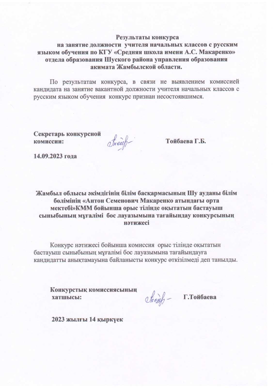 Бос лауазымына тағайындау конкурсыны нәтижесі » «Жамбыл облысы әкімдігінің білім басқармасы Шу ауданының білім бөлімінің «Антон Семенович Макаренко атындағы орта мектебі» коммуналдық мемлекеттік мекемесі
