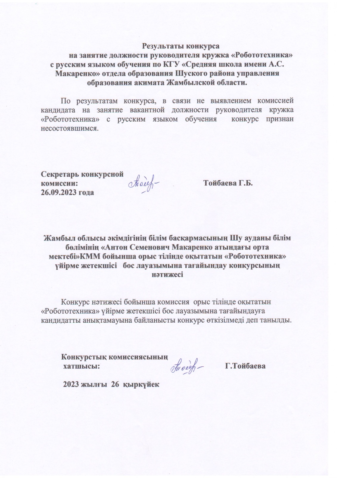 Бос лауазымына (тұрақты) тағайындау конкурсының нәтижесі » «Жамбыл облысы әкімдігінің білім басқармасы Шу ауданының білім бөлімінің «Антон Семенович Макаренко атындағы орта мектебі» коммуналдық мемлекеттік мекемесі