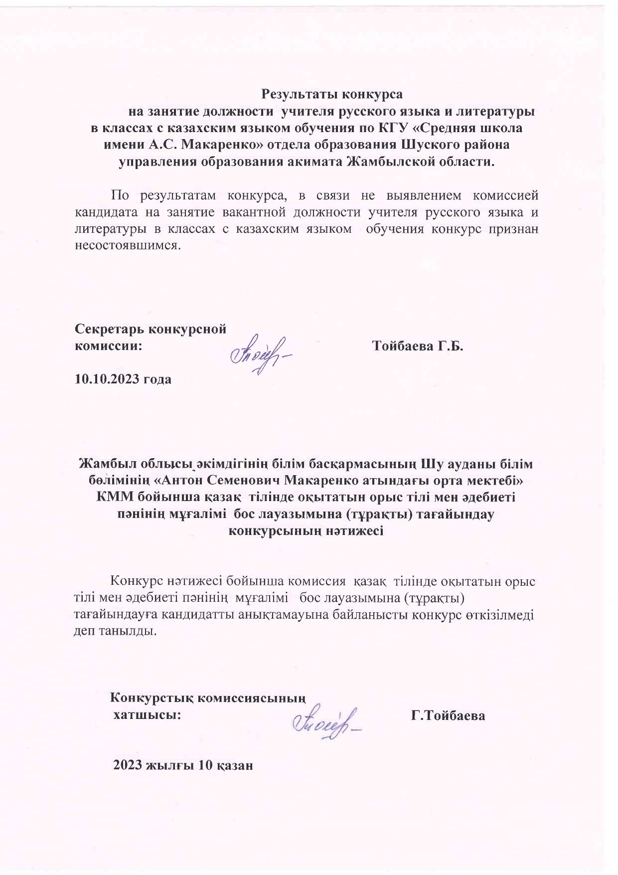 Результаты конкурса на занятие должности учителя русского языка и литературы в классах с казахским языком обучения » «Жамбыл облысы әкімдігінің білім басқармасы Шу ауданының білім бөлімінің «Антон Семенович Макаренко атындағы орта мектебі» коммуналдық мемлекеттік мекемесі