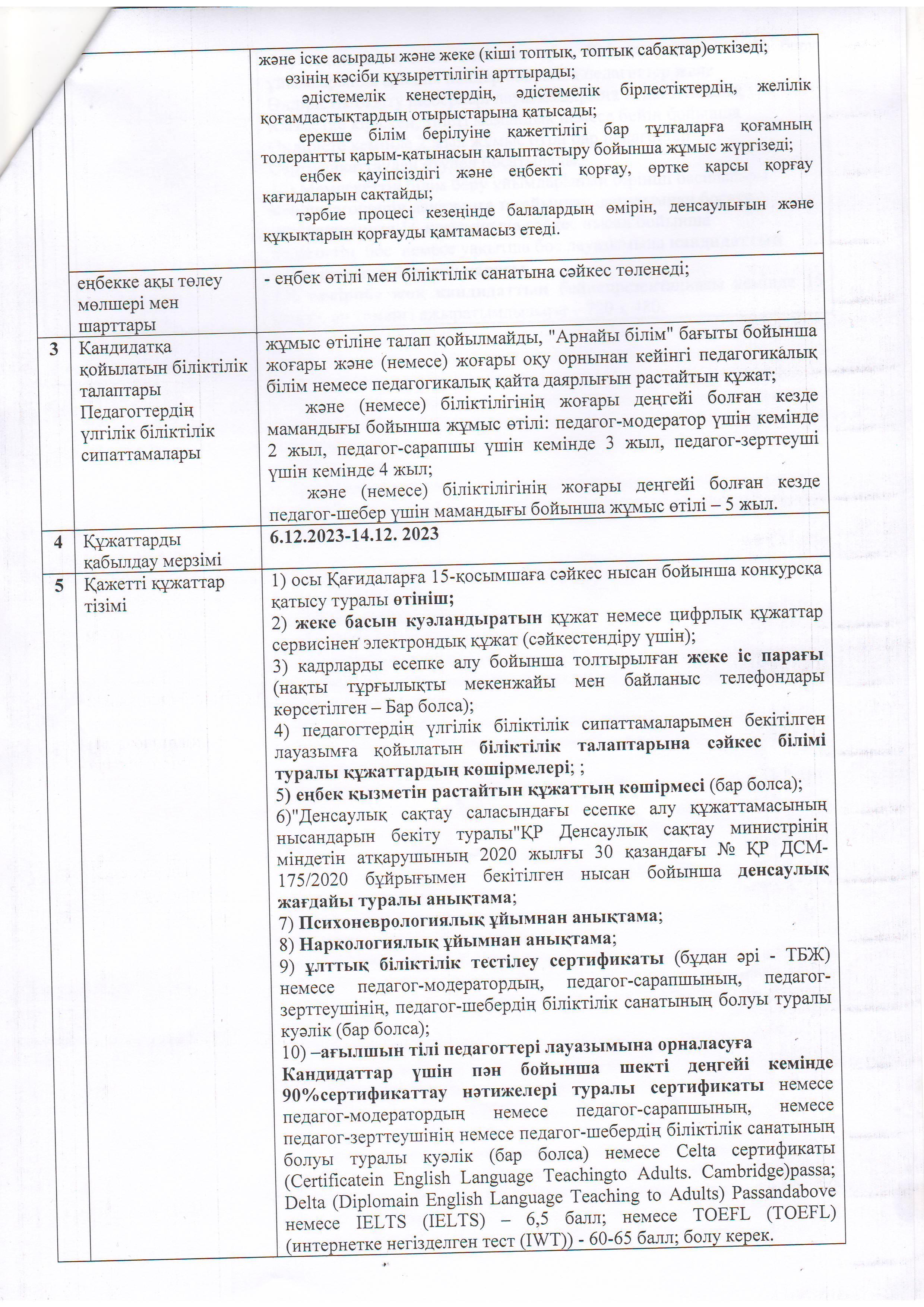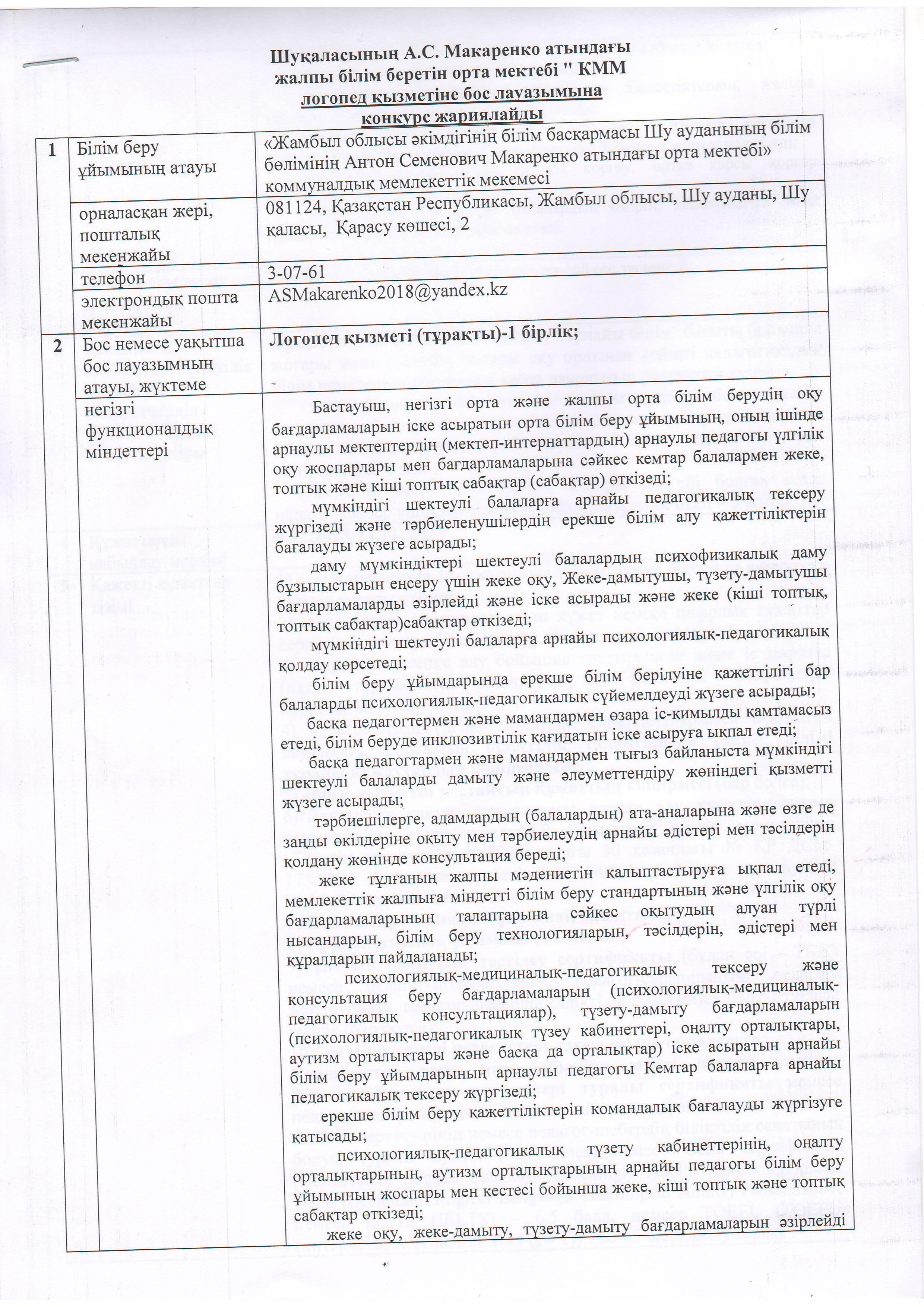 05 декабрь 2023 0 1 2 3 4 5 А.С.Макаренко атындағы орта мектебінде логопед қызметіне бос лауазымына конкурс жариялайды