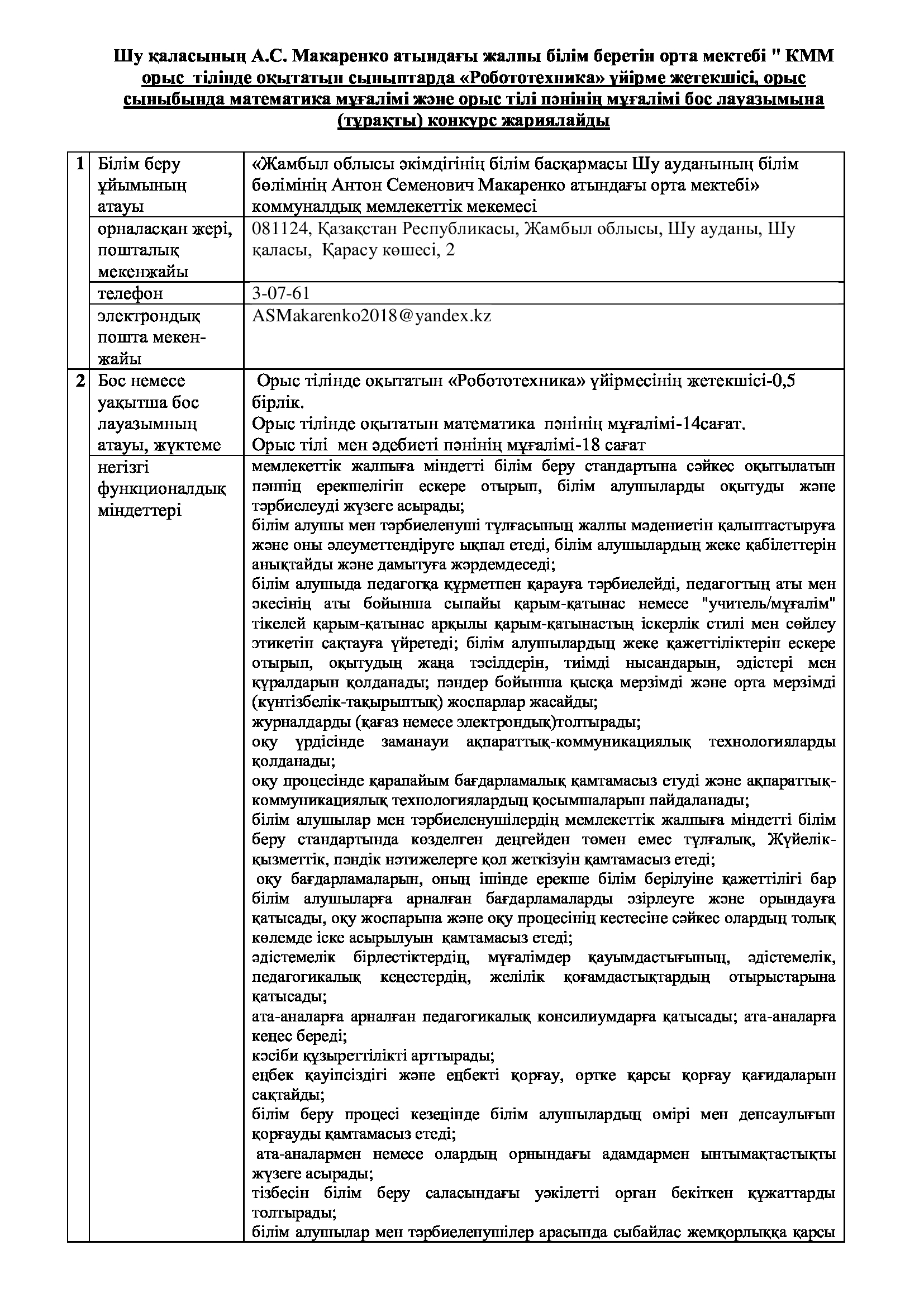Орыс тілінде оқытатын сыныптарда «Робототехника» үйірме жетекшісі, орыс сыныбында математика мұғалімі және орыс тілі пәнінің мұғалімі бос лауазымына (тұрақты) конкурс жариялайды » «Жамбыл облысы әкімдігінің білім басқармасы Шу ауданының білім бөлімінің «Антон Семенович Макаренко атындағы орта мектебі» коммуналдық мемлекеттік мекемесі