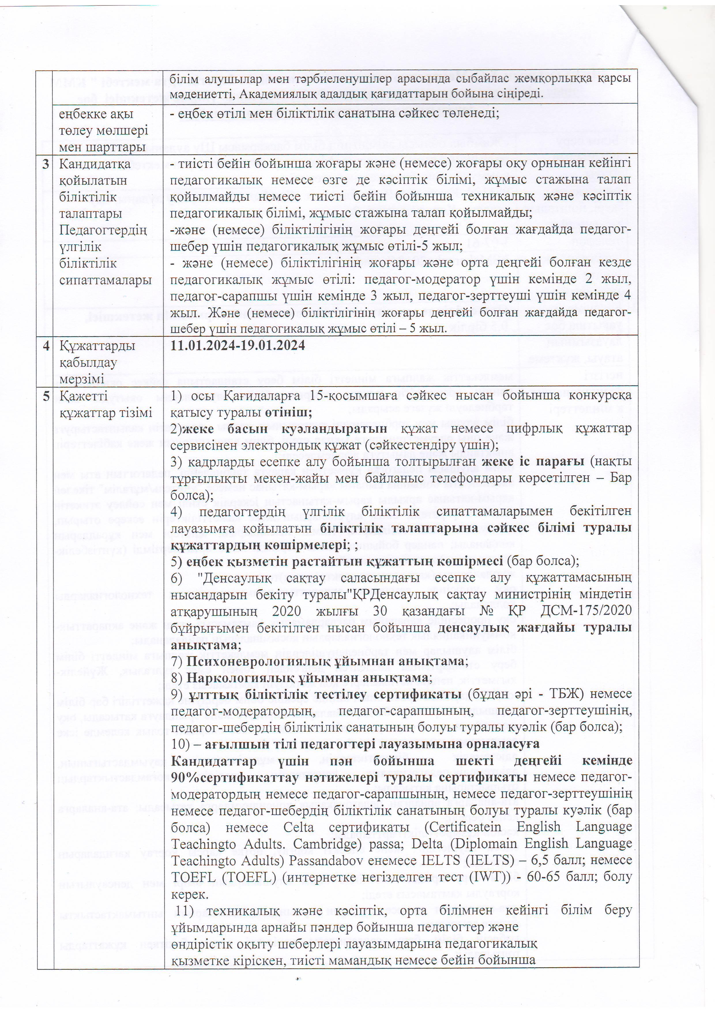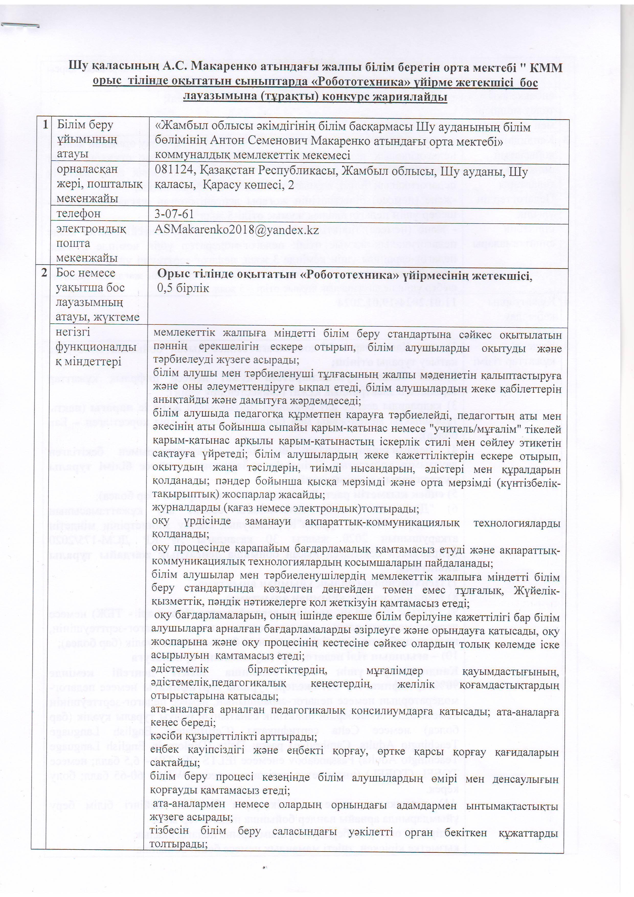 Орыс тілінде оқытатын сыныптарда Робототехника үйірме жетекшісі бос лауазымына (тұрақты) конкурс жариялайды » «Жамбыл облысы әкімдігінің білім басқармасы Шу ауданының білім бөлімінің «Антон Семенович Макаренко атындағы орта мектебі» коммуналдық мемлекеттік мекемесі