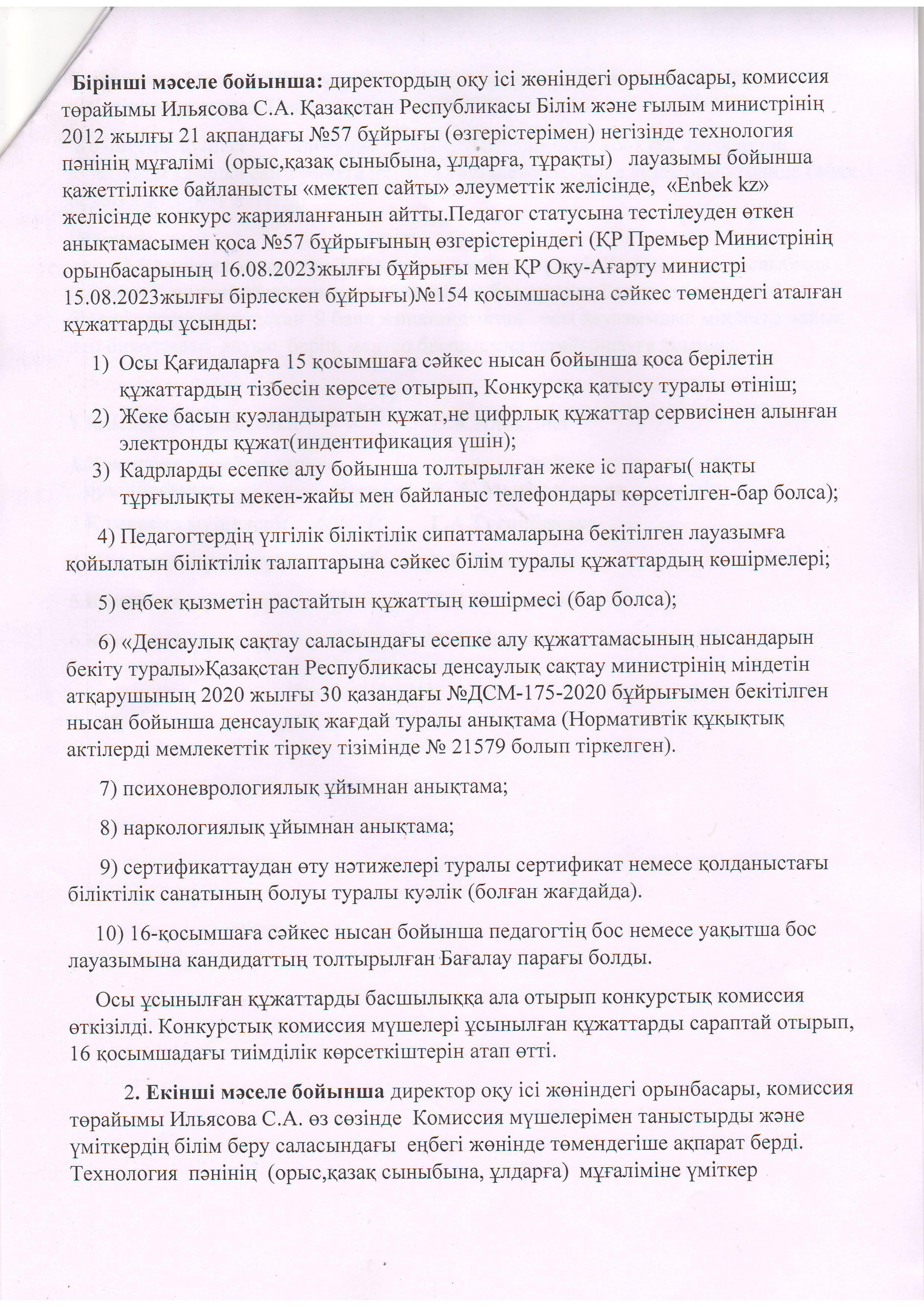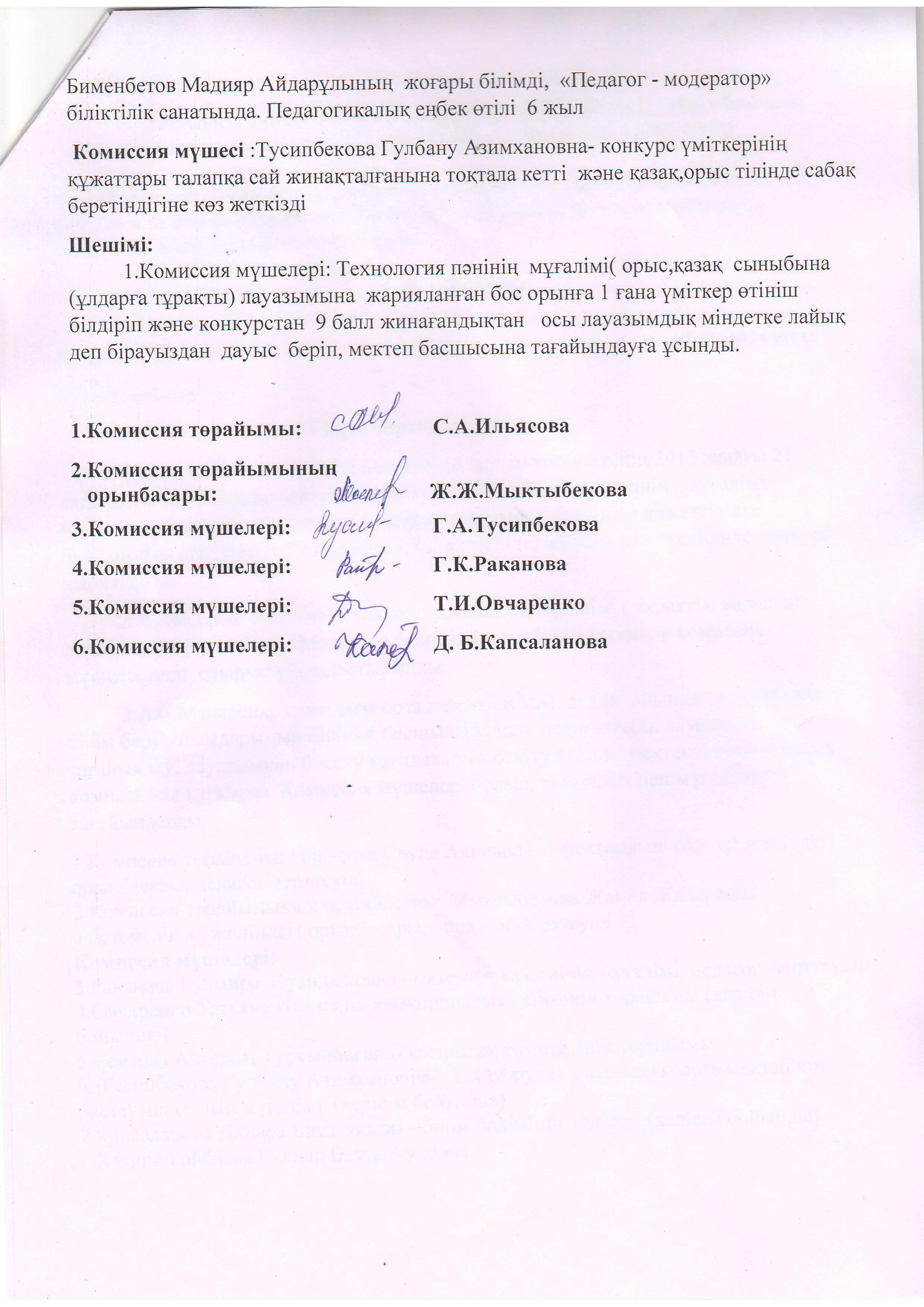 Қазақ, орыс технология пәнінің мұғалімі (тұрақты, ұлдарға) лауазымына Бименбетов Мадияр Айдарұлының өтініші негізінде комиссия мүшелерімен отырыс ұйымдастырылды.