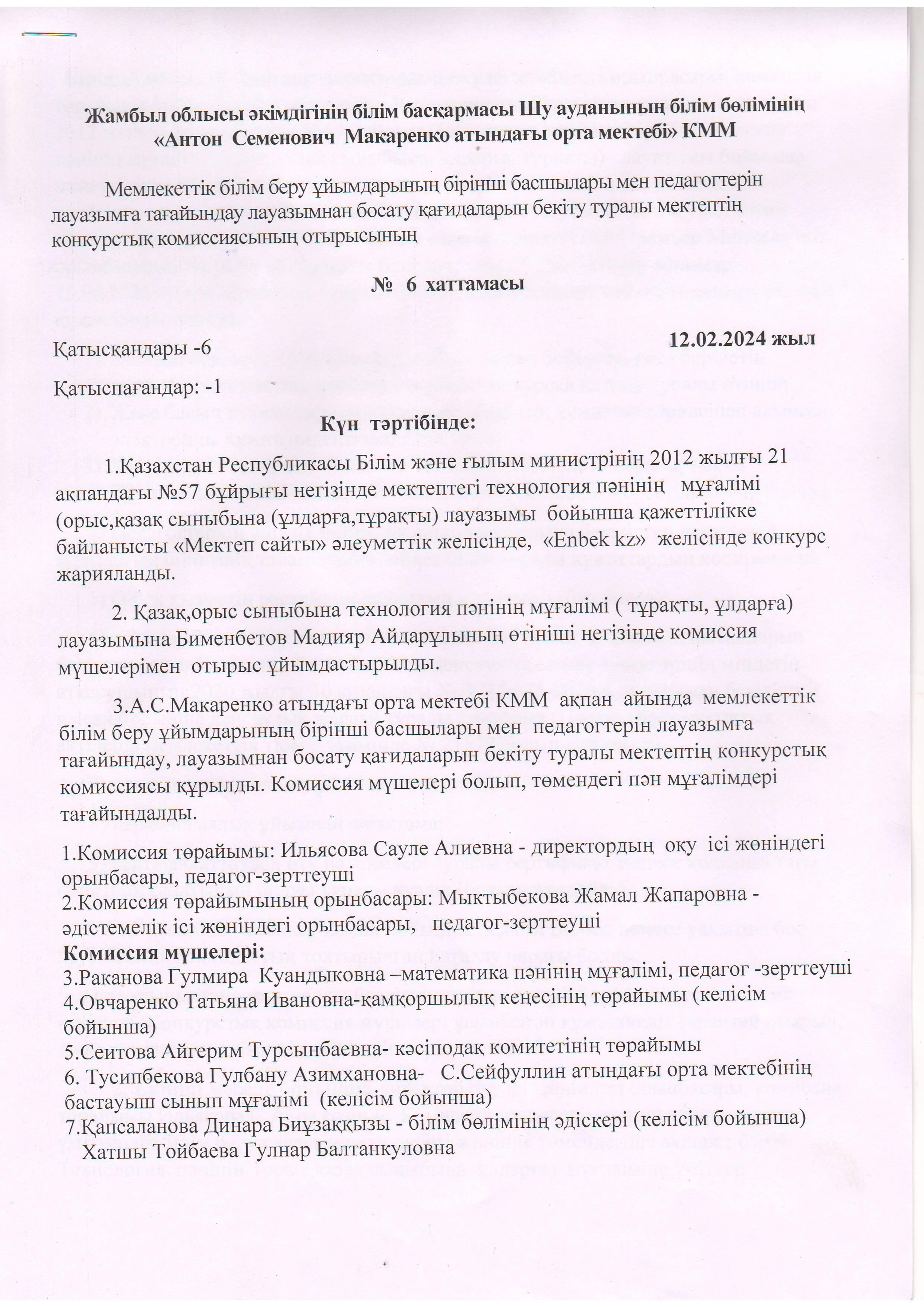Қазақ, орыс технология пәнінің мұғалімі (тұрақты, ұлдарға) лауазымына Бименбетов Мадияр Айдарұлының өтініші негізінде комиссия мүшелерімен отырыс ұйымдастырылды. » «Жамбыл облысы әкімдігінің білім басқармасы Шу ауданының білім бөлімінің «Антон Семенович Макаренко атындағы орта мектебі» коммуналдық мемлекеттік мекемесі