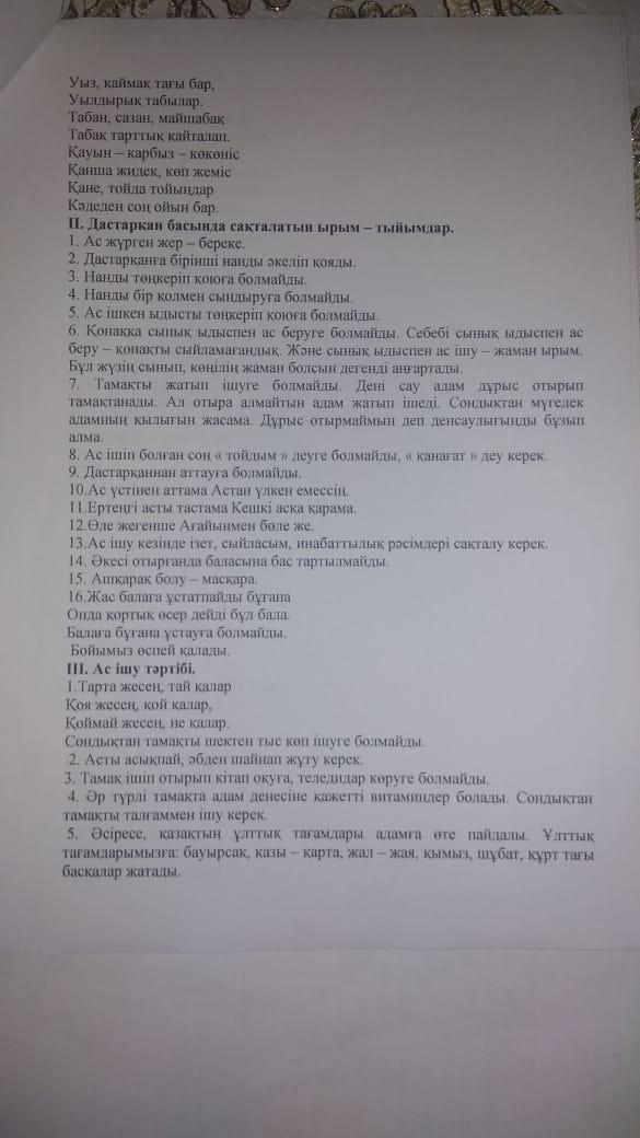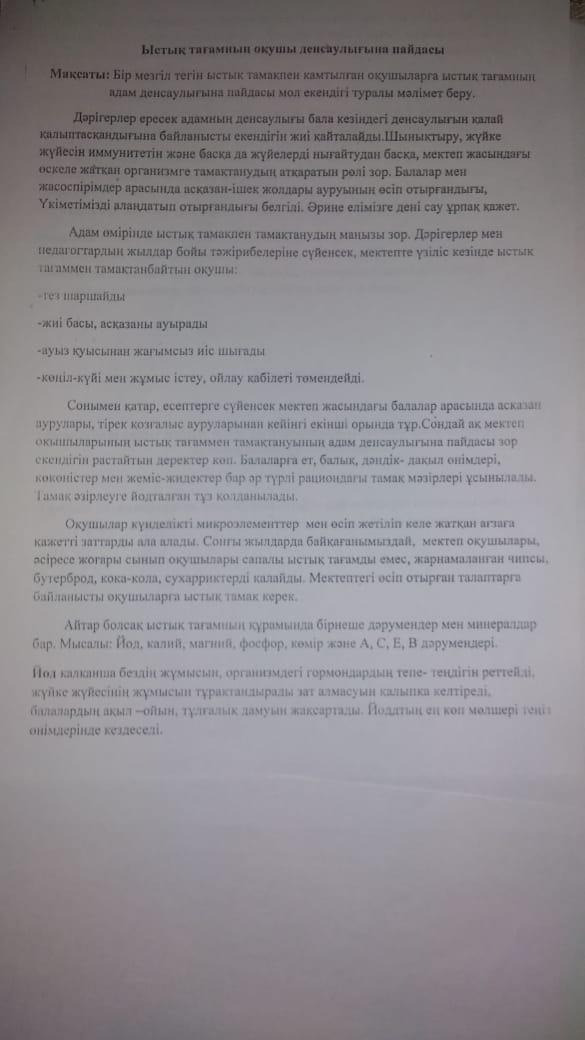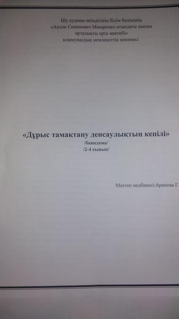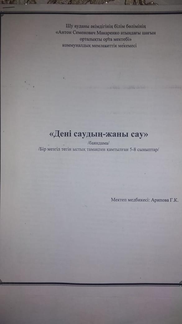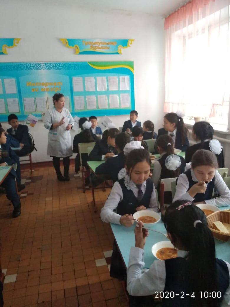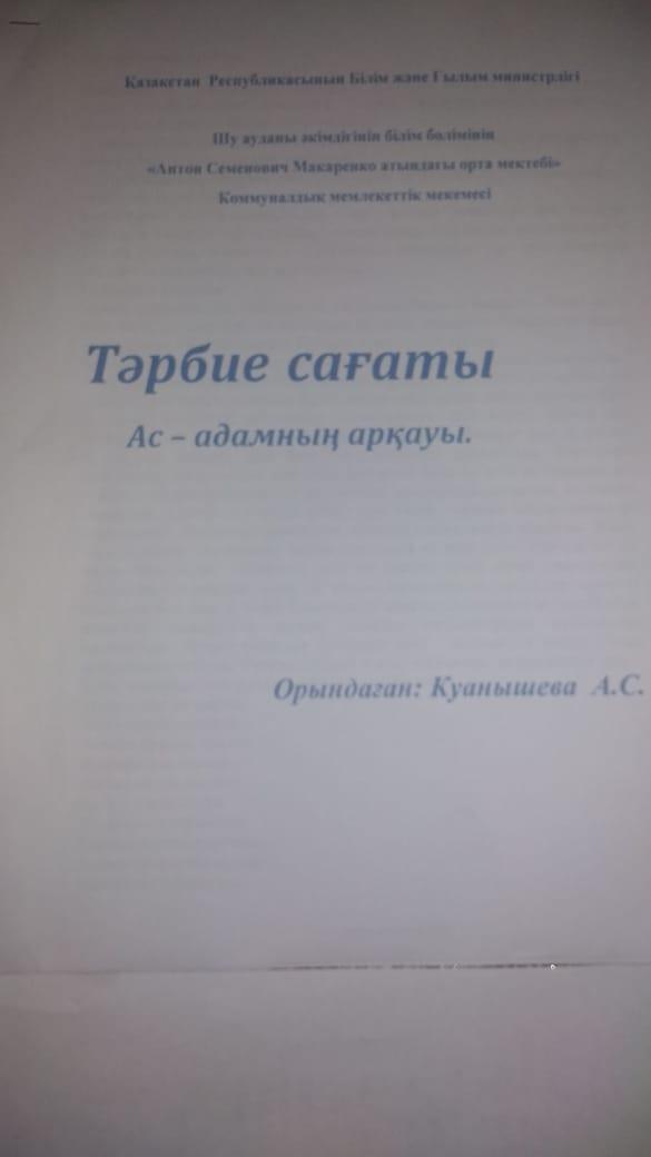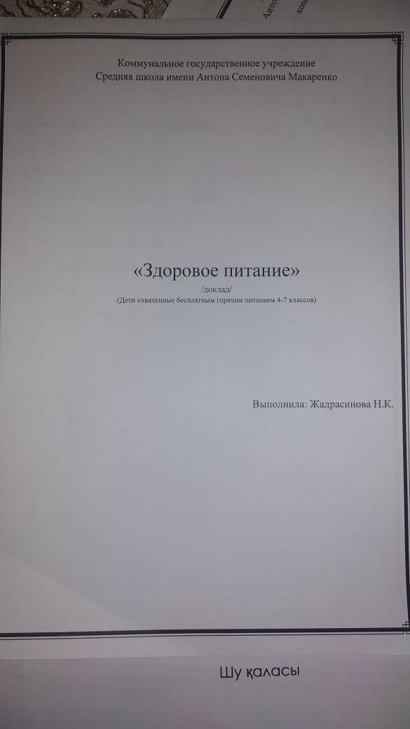 Бір мезгіл тегін ыстық тамақпен қамтылған оқушыларға тамақты дұрыс ұйымдастыру бойынша жүргізілген жұмыстар. » «Жамбыл облысы әкімдігінің білім басқармасы Шу ауданының білім бөлімінің «Антон Семенович Макаренко атындағы орта мектебі» коммуналдық мемлекеттік мекемесі