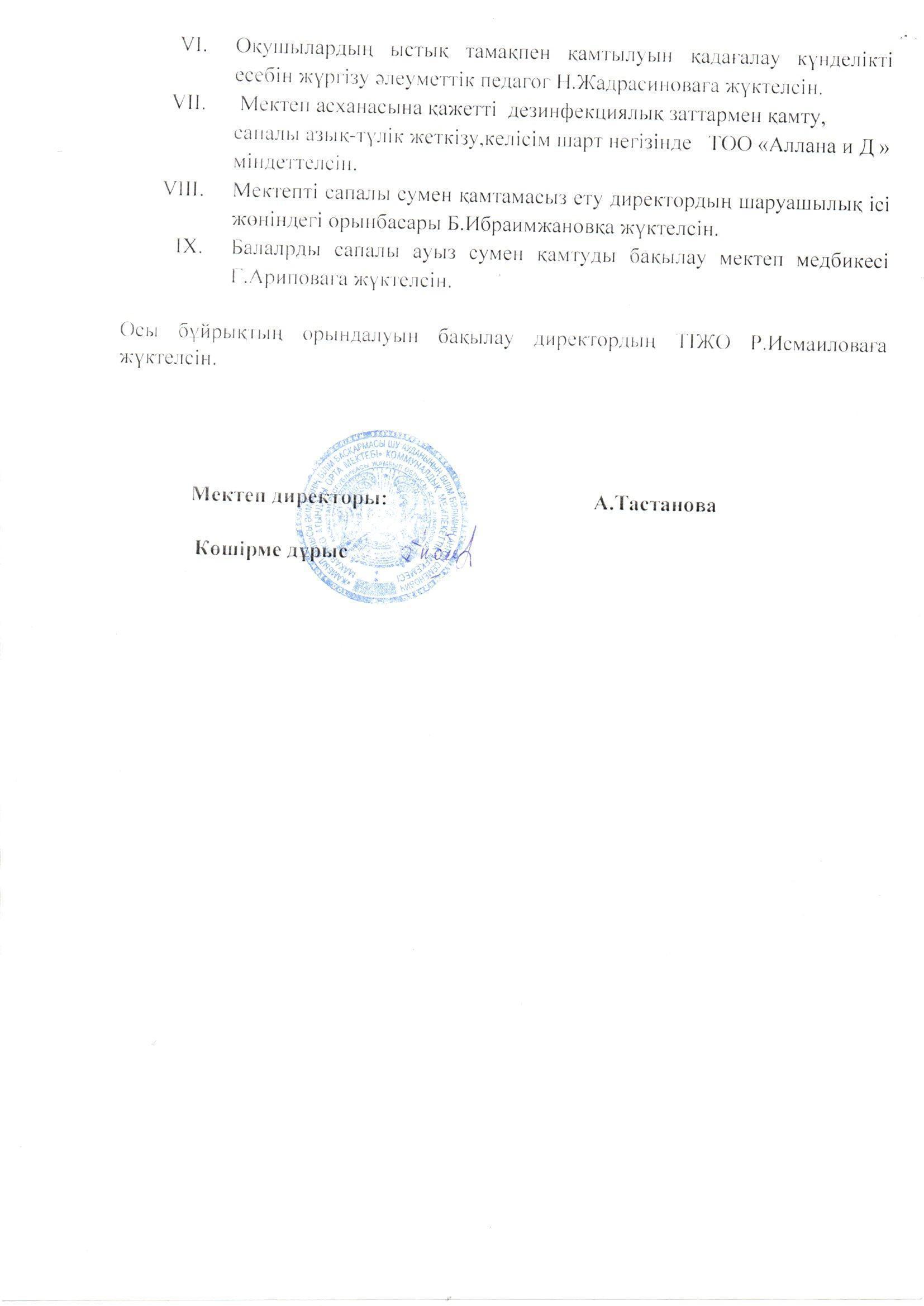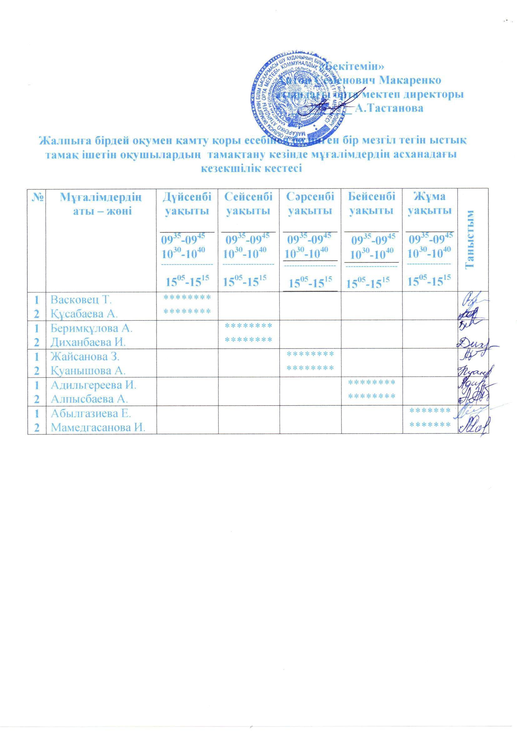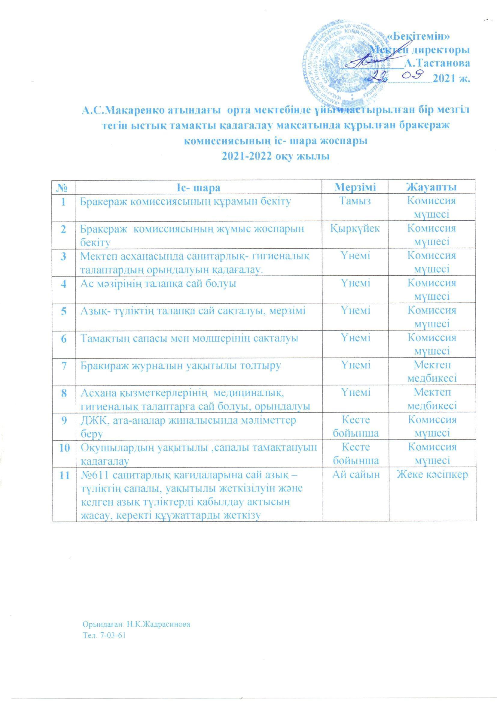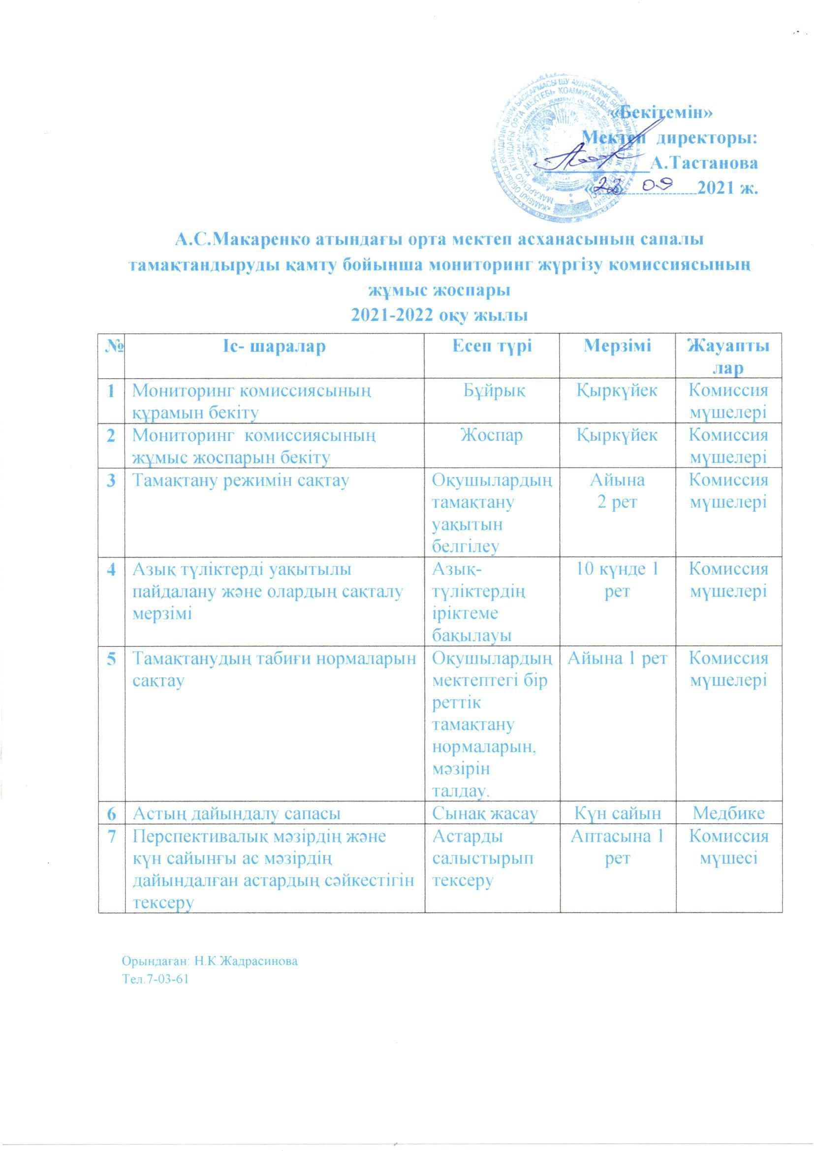 Бір мезгіл тегін ыстық тамақты ұйымдастыру бойынша бұйрық, мониторинг комиссиясы мен бракераж комиссиясының іс-шара жоспарлары. Мониторинг көрсеткіші. » «Жамбыл облысы әкімдігінің білім басқармасы Шу ауданының білім бөлімінің «Антон Семенович Макаренко атындағы орта мектебі» коммуналдық мемлекеттік мекемесі