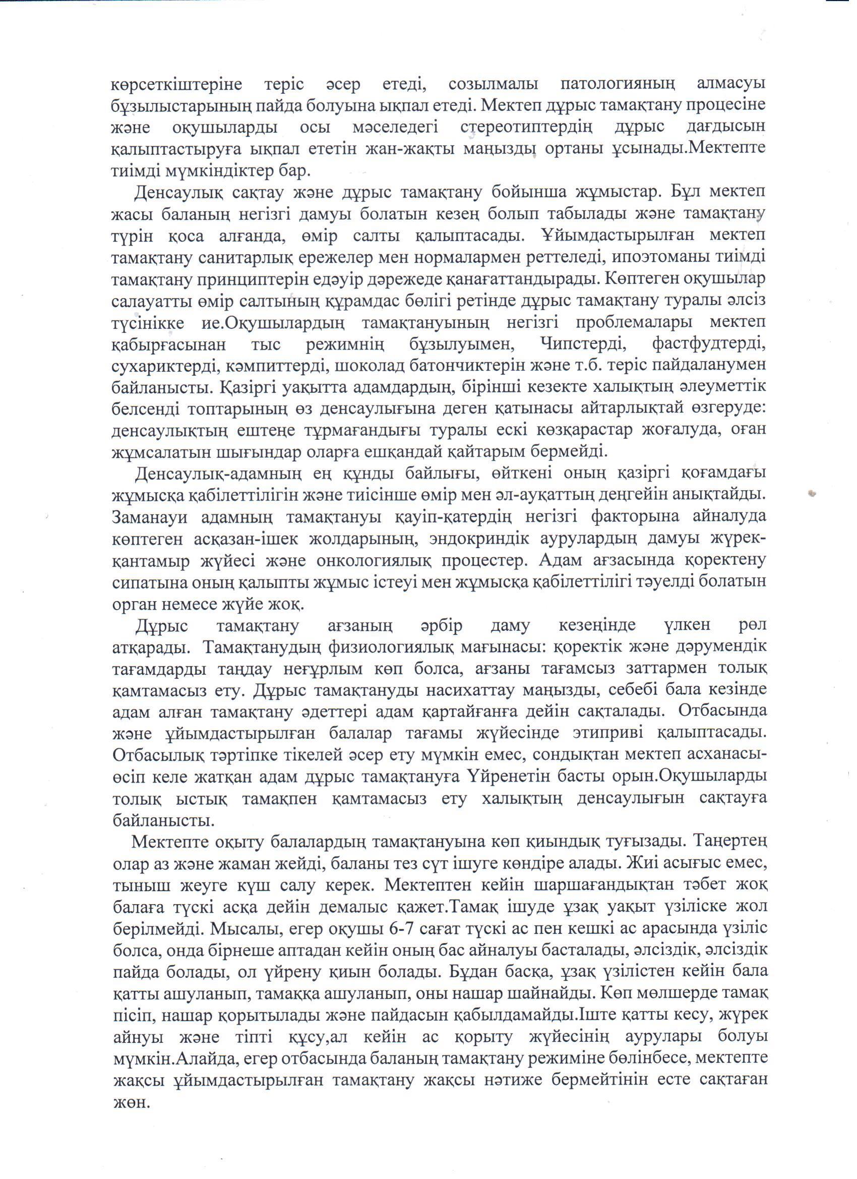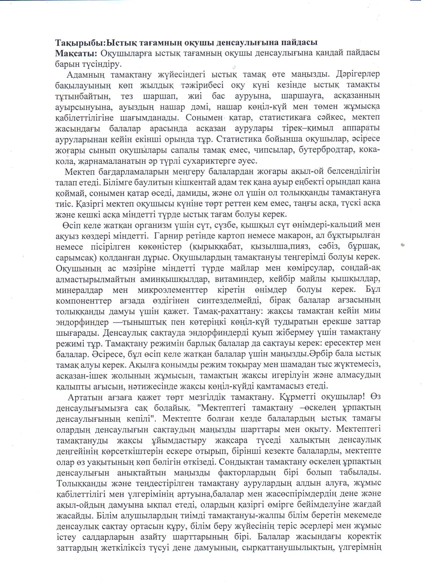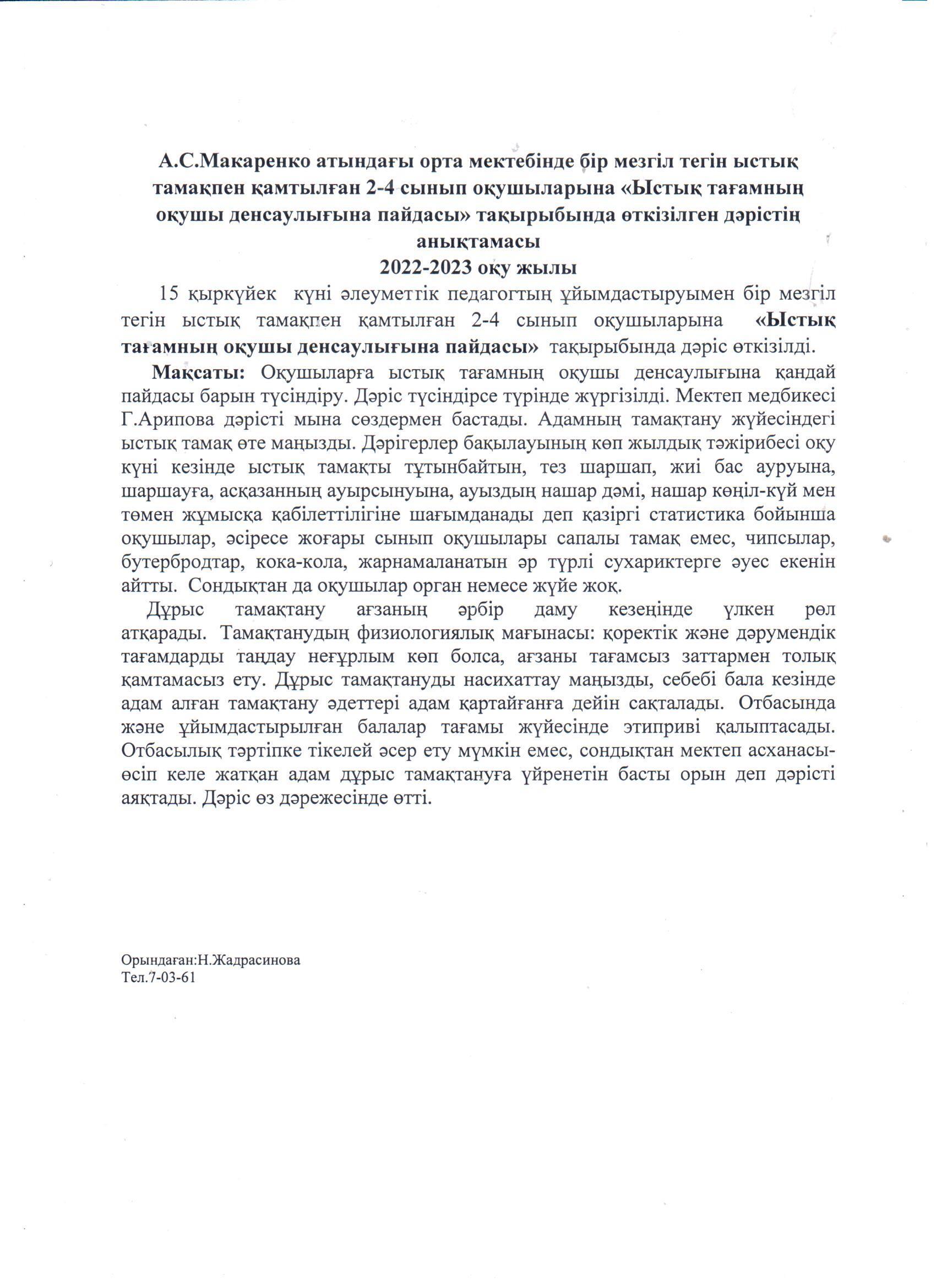 "Ыстық тағамның оқушы денсаулығына пайдасы" тақырыбында өткізілген дәріс » «Жамбыл облысы әкімдігінің білім басқармасы Шу ауданының білім бөлімінің «Антон Семенович Макаренко атындағы орта мектебі» коммуналдық мемлекеттік мекемесі