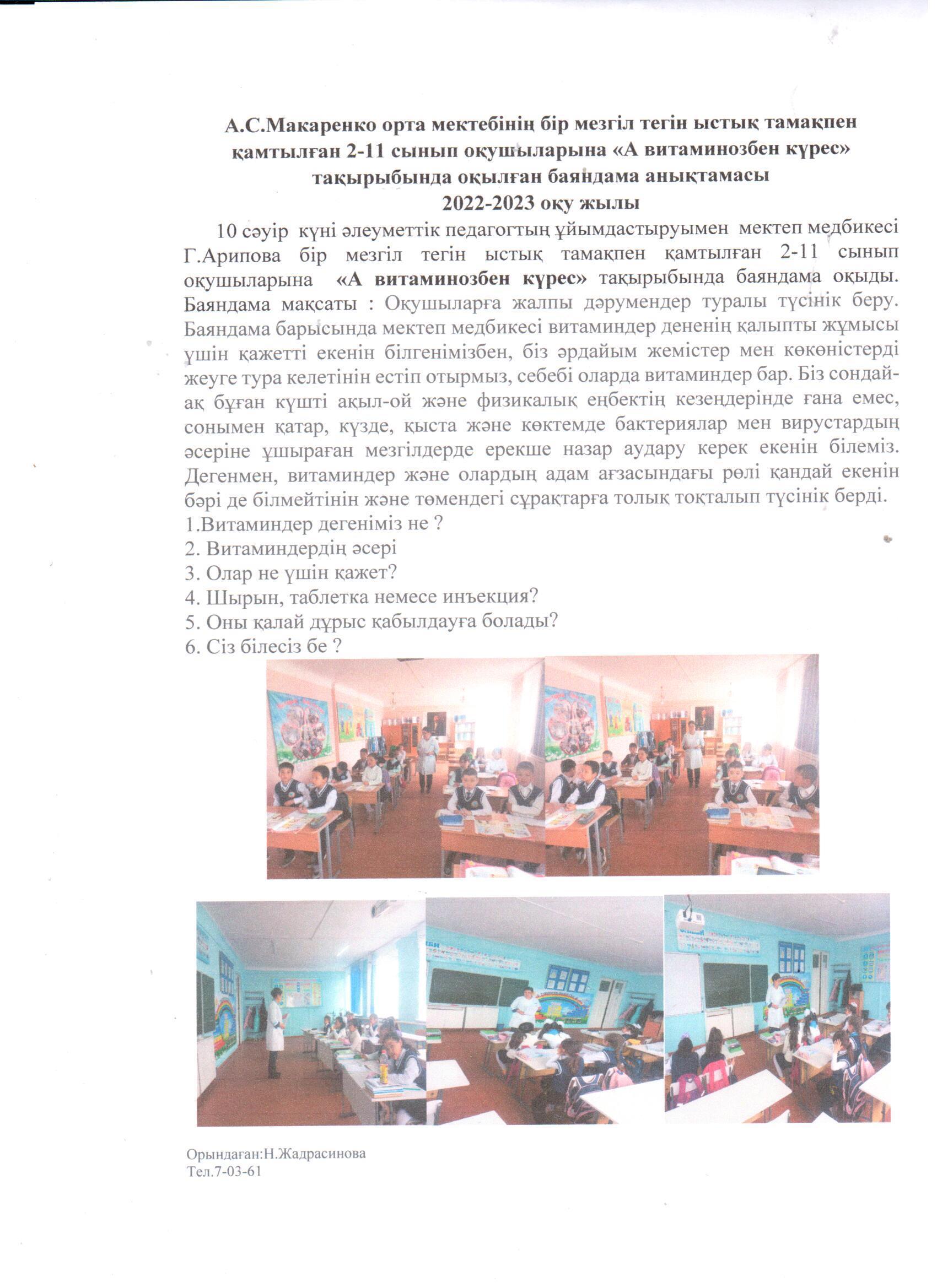 "А витаминозбен күрес" тақырыбында оқылған баяндаманың анықтамасы » «Жамбыл облысы әкімдігінің білім басқармасы Шу ауданының білім бөлімінің «Антон Семенович Макаренко атындағы орта мектебі» коммуналдық мемлекеттік мекемесі