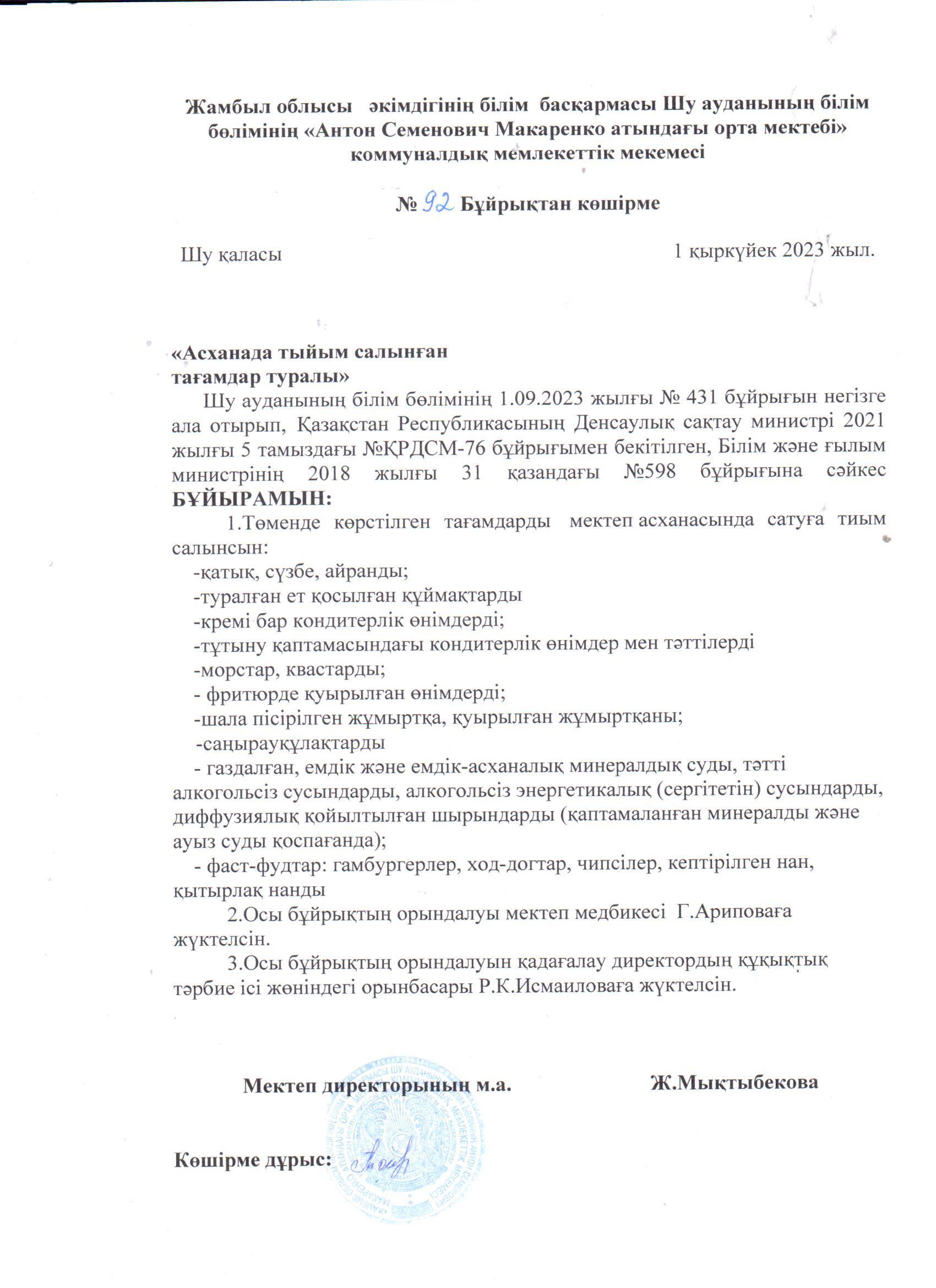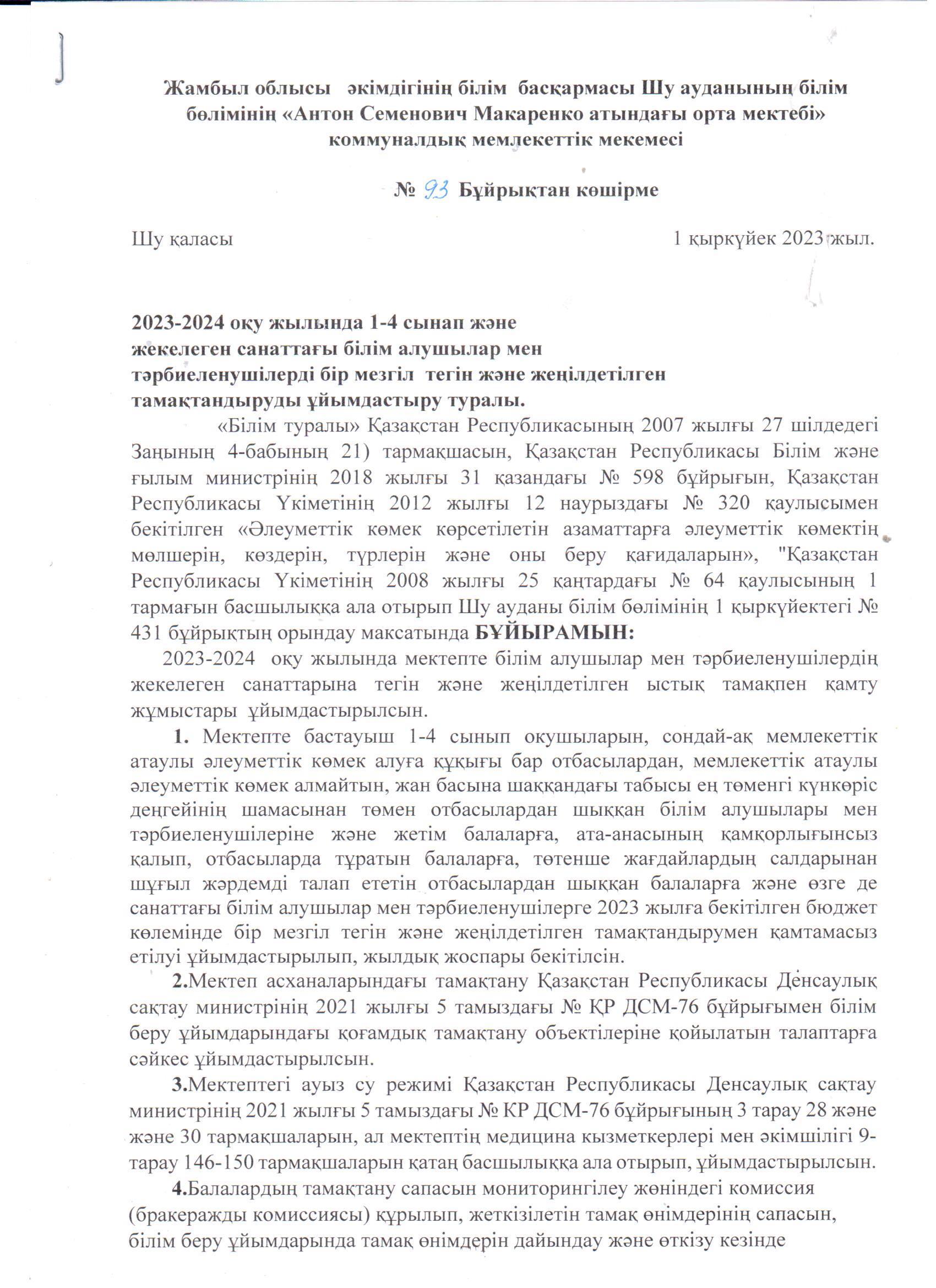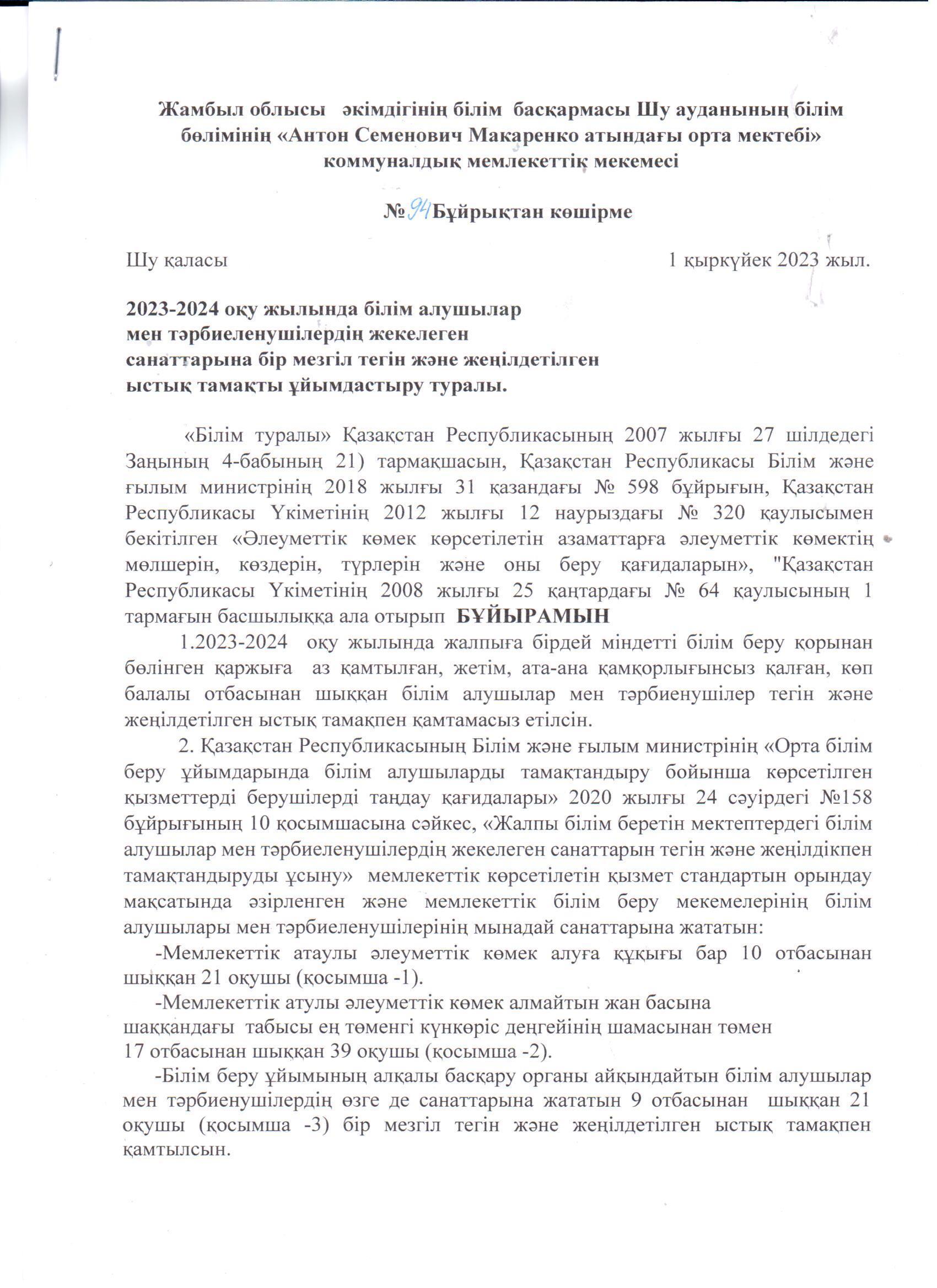 2023-2024 о/ж бастауыш 1-4 сынып және жекелеген санаттағы білім алушылар мен тәрбиеленушілерді бір мезгіл тегін және жеңілдетілген тамақтануды ұйымдастыру » «Жамбыл облысы әкімдігінің білім басқармасы Шу ауданының білім бөлімінің «Антон Семенович Макаренко атындағы орта мектебі» коммуналдық мемлекеттік мекемесі