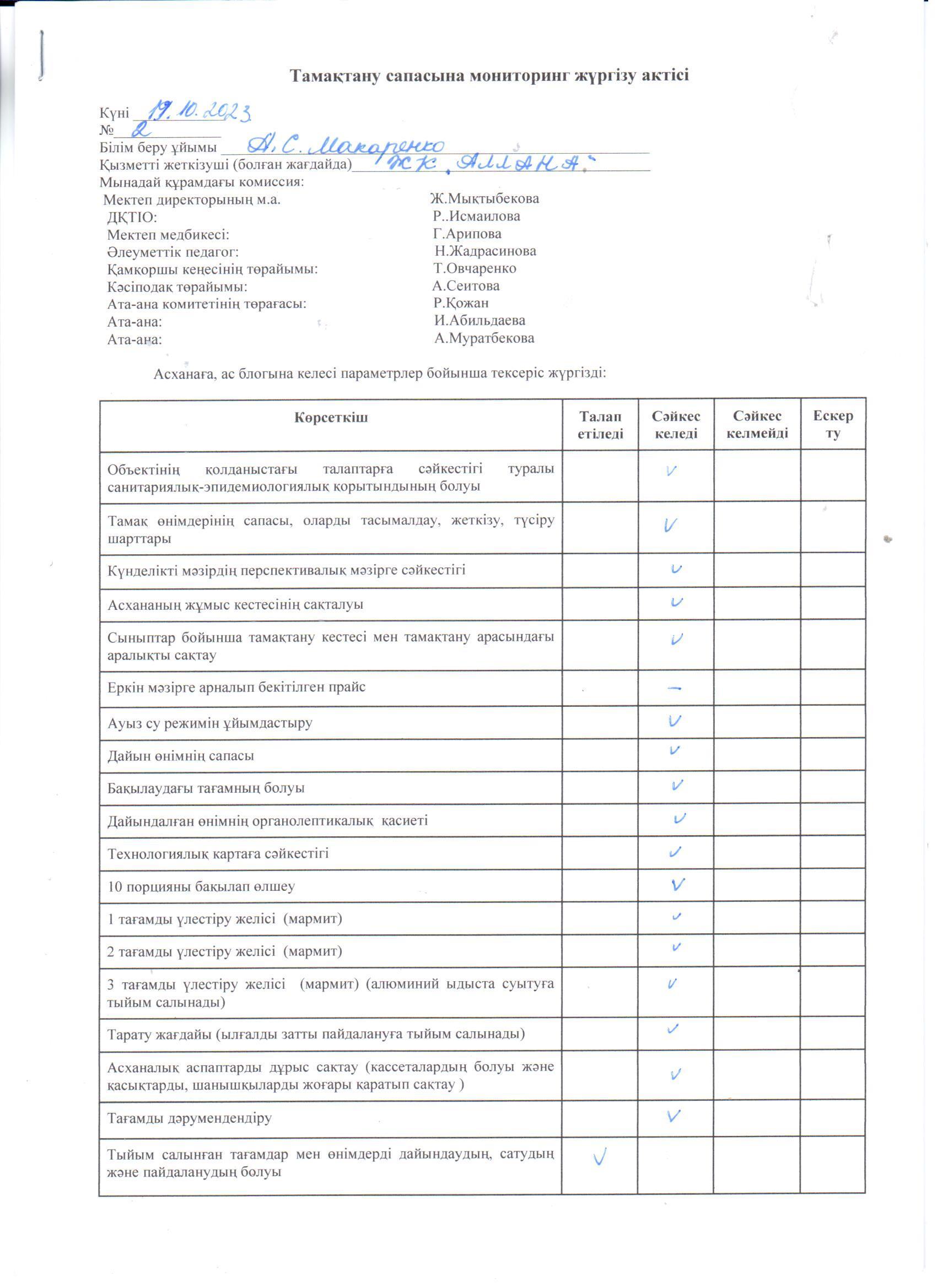 Тамақтану сапасына мониторинг жүргізу актісі » «Жамбыл облысы әкімдігінің білім басқармасы Шу ауданының білім бөлімінің «Антон Семенович Макаренко атындағы орта мектебі» коммуналдық мемлекеттік мекемесі