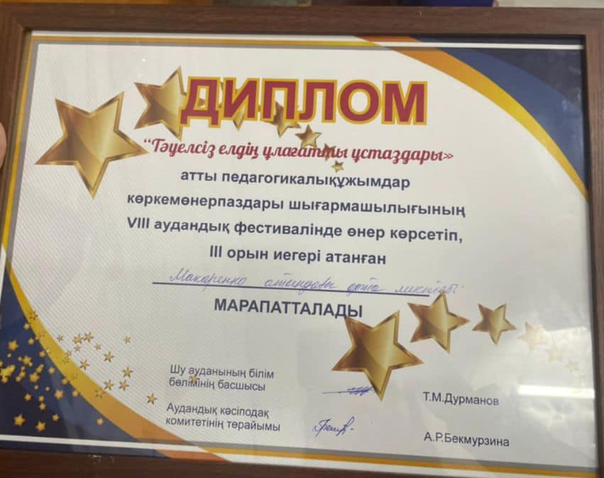 Шу ауданы білім бөлімінің Антон Семенович Макаренко атындағы орта мектебінің ұжымы Қазақстандық оқу-ағарту, ғылым және жоғары білім қызметкерлерінің салалық кәсіподағының құрылғанына 100 жыл толуына орай «БІЛІМ КӘСІПОДАҒЫ: 100 ЖЫЛ – БІР БАҒЫТ, БІР МАҚСАТ, БІР МҮДДЕ» тақырыбы аясында өткізілген «ТӘУЕЛСІЗ ЕЛДІҢ ҰЛАҒАТТЫ ҰСТАЗДАРЫ” атты педагогикалық ұжымдар көркемөнерпаздары шығармашылығының VІІІ аудандық фестиваліне қатысып жүлделі ІII-ші орын иеленді.Құтты болсын!!!!