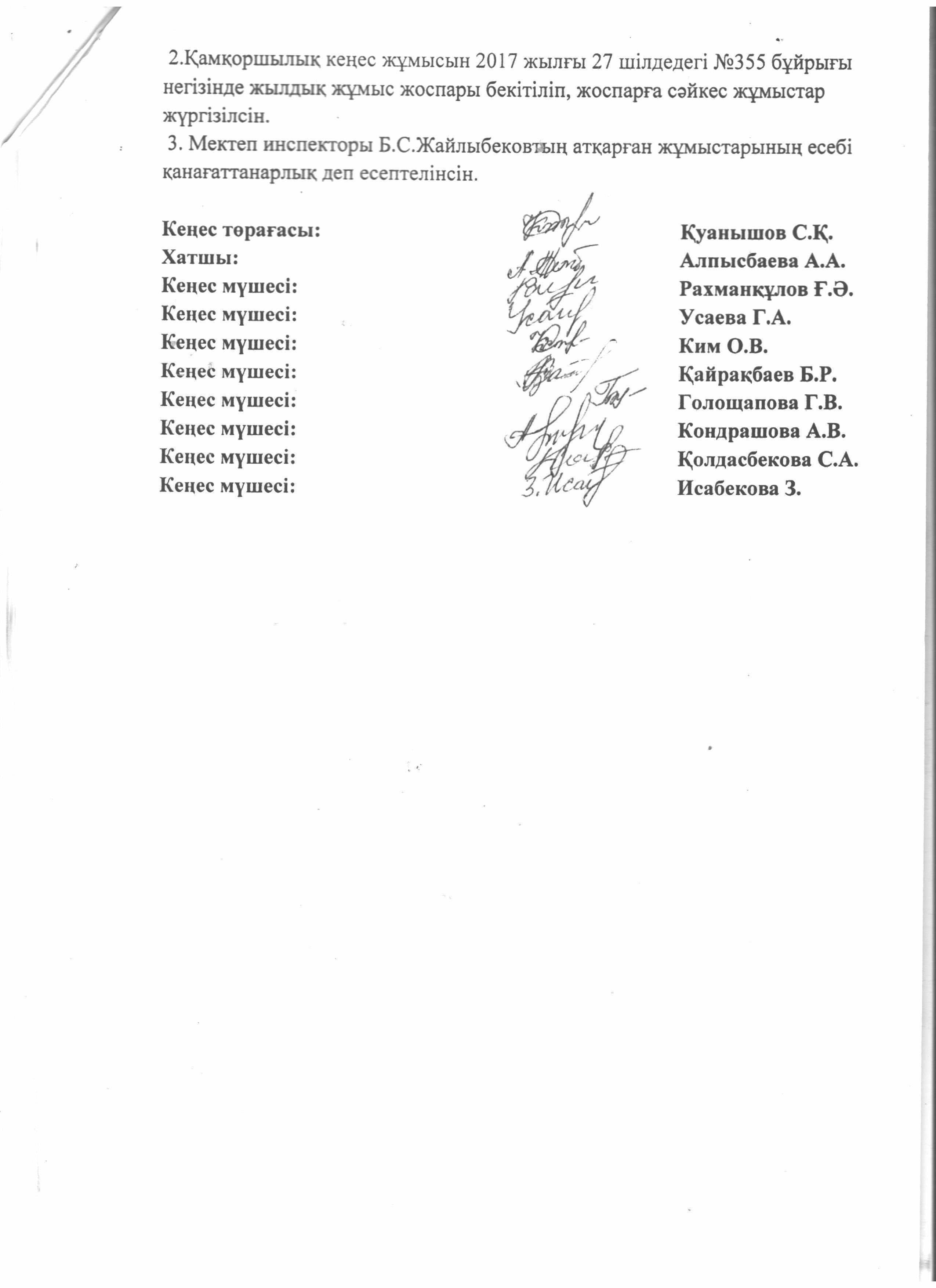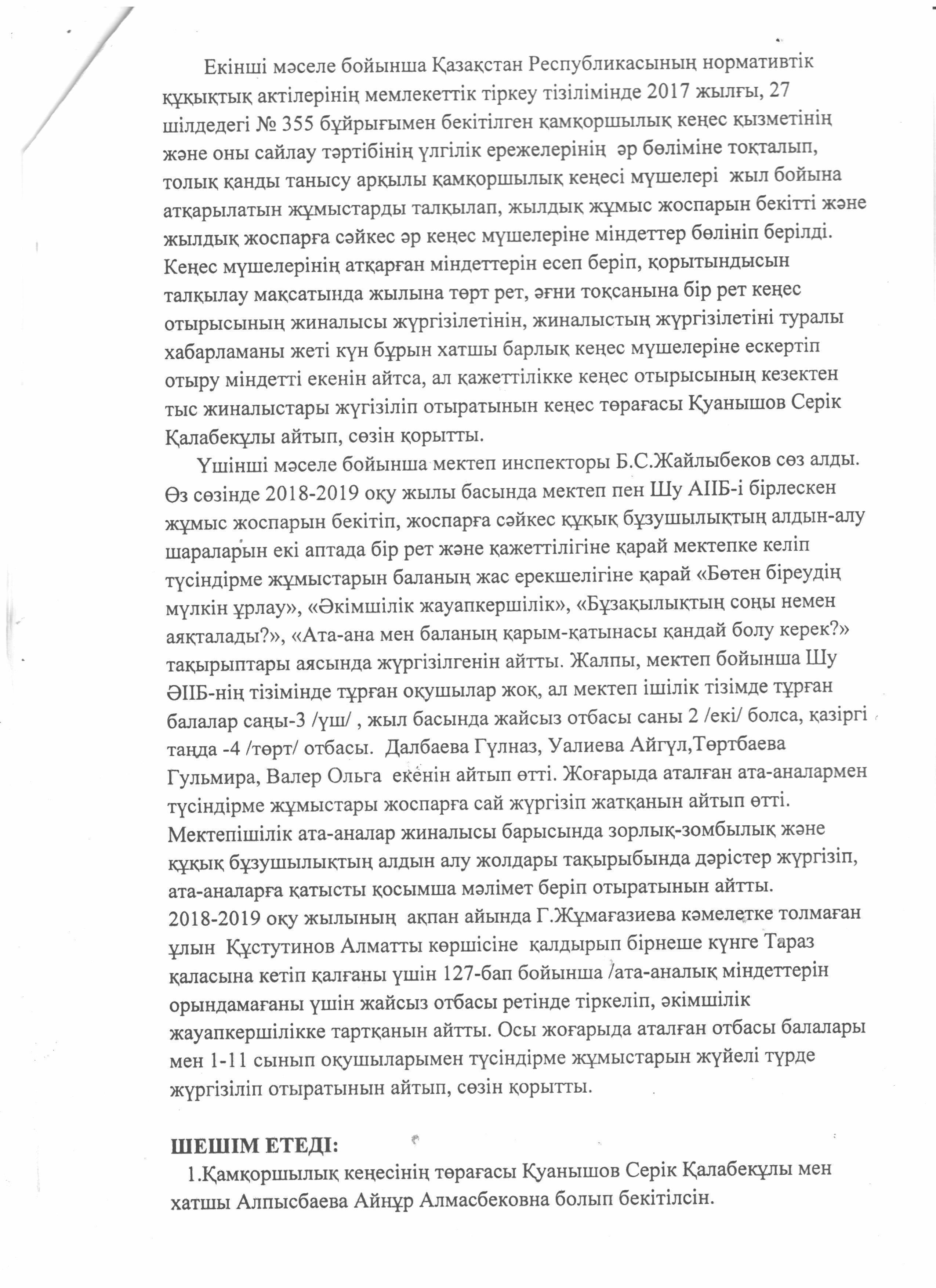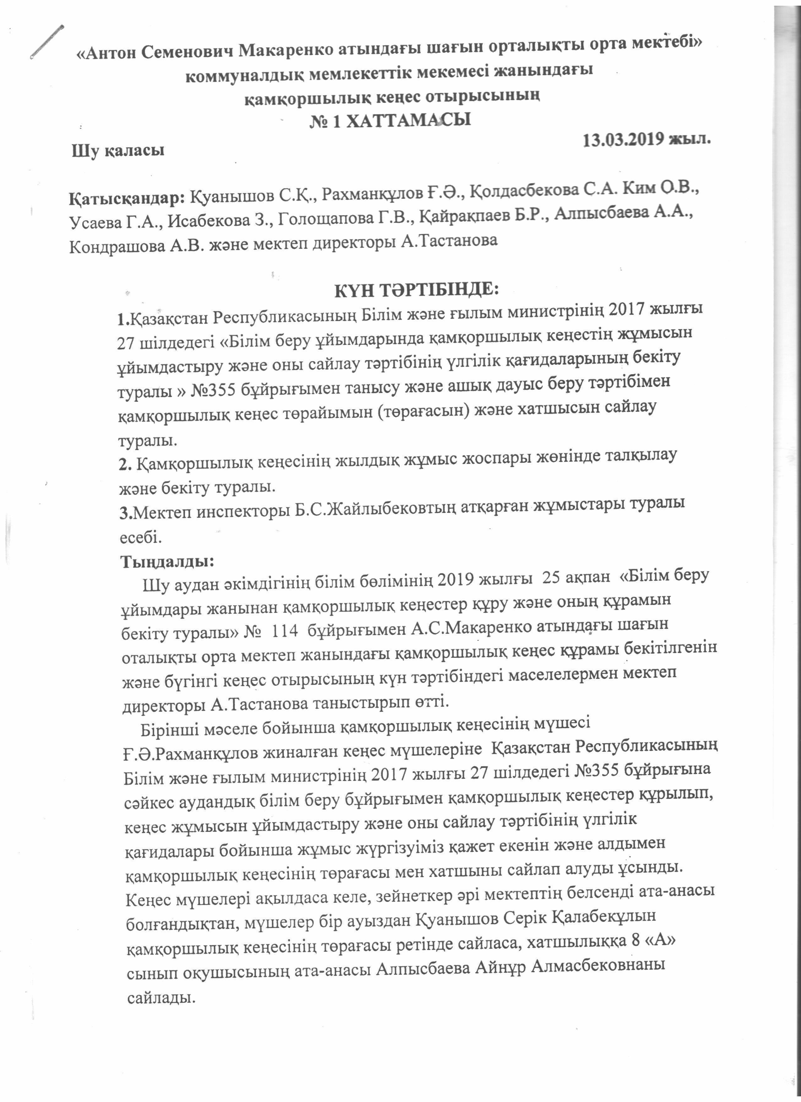Қамқоршылық кеңес. Хаттама. » «Жамбыл облысы әкімдігінің білім басқармасы Шу ауданының білім бөлімінің «Антон Семенович Макаренко атындағы орта мектебі» коммуналдық мемлекеттік мекемесі